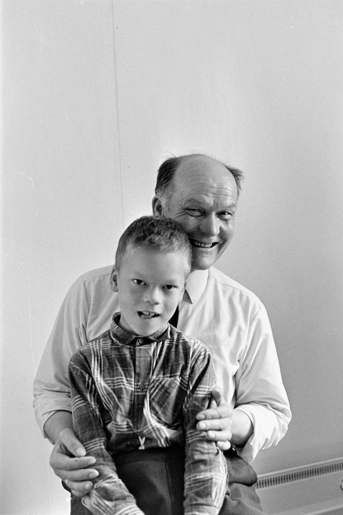 "En man håller om en pojke. Mannen har intervjuats av paret Ruong. Israel Ruong skriver: ""Den 2 aug. körde vi runt i Skåuland och intervjuade sammanlagt 6 personer.