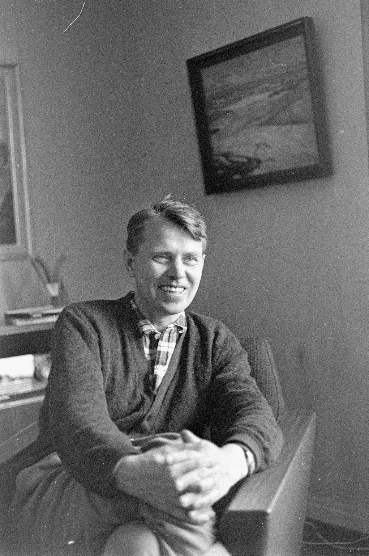 En leende man i fåtölj intervjuas av paret Ruong. Israel Ruong antecknar: "Den 3 aug körde vi över Grovfjordbygden till Narvik - i hällande regn. På väg till Evenes pratade vi med en odalman som höll pả att bärga hö i regn och stark blåst frân fjorden (Narviksfjorden). Var och hälsade på hos rektor Sven Myrnes som intervjuades om skol- och kulturförhållanden, band 39, bild 10:24. Vi körde sedan genom John Nyheims hemtrakt i trängre mening ned mot Grovfjord. Jfr bild 10:25, som föreställer en skola där han undervisat."