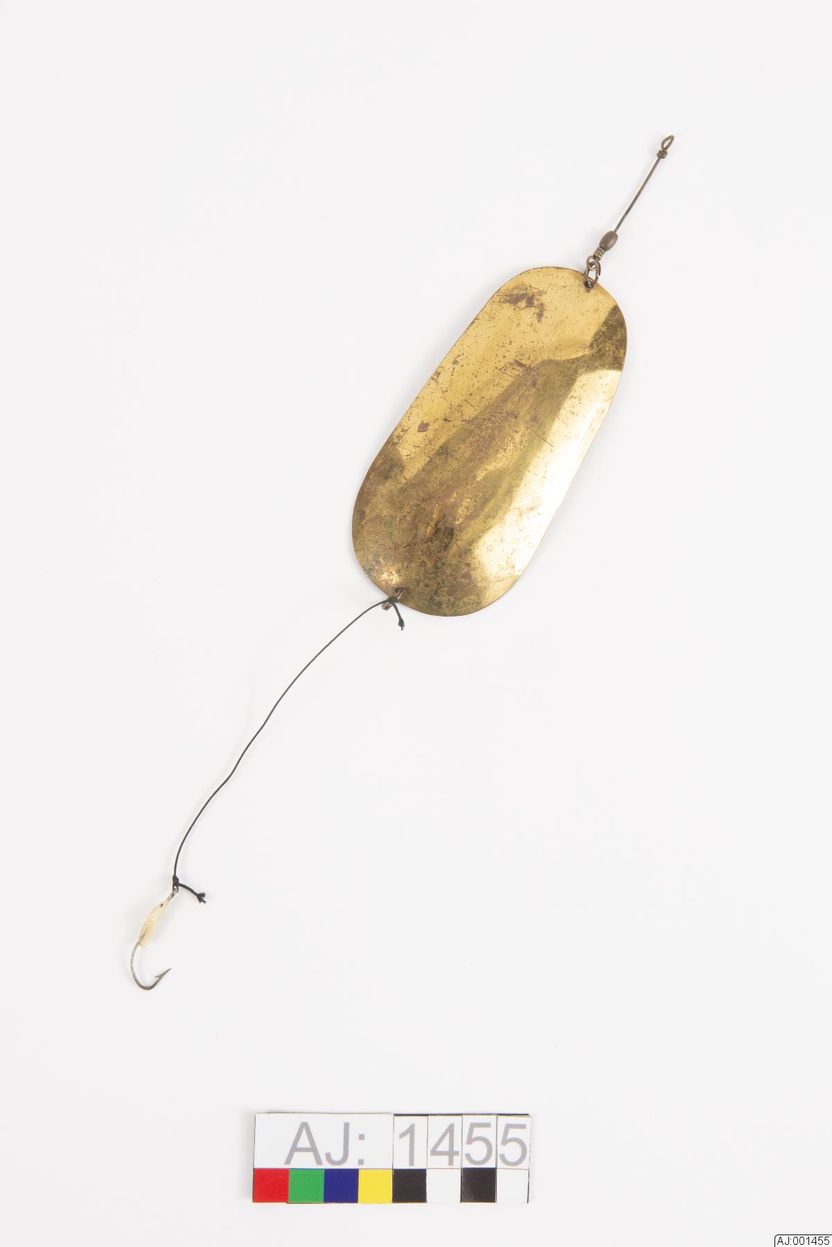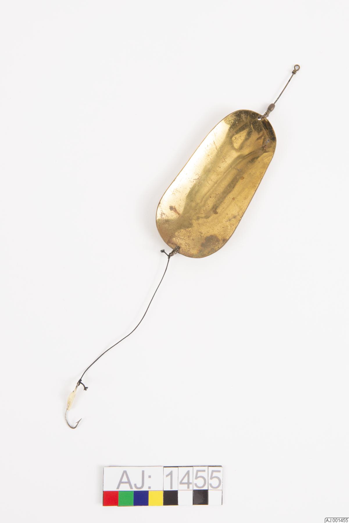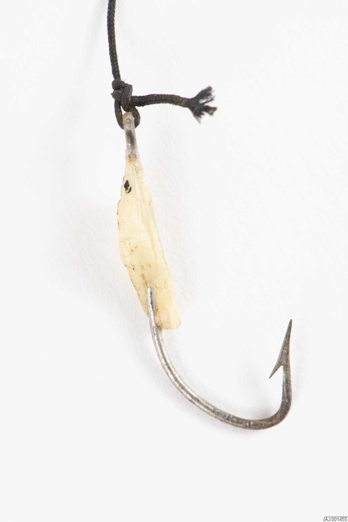 Oval form. Krok m. hulling. Plast(?)applikation. Svart nylonlina. Längd m. krok och tafs: ca 31 cm. B: 6 cm.