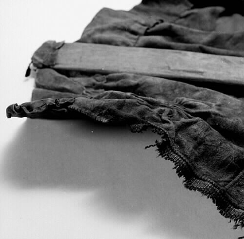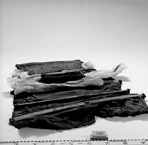Med dörrbräda och 8 st. spjälor fastsydda på insidan och nedtill handvävt band i yllegarn i grönt, svart, gult och rött.