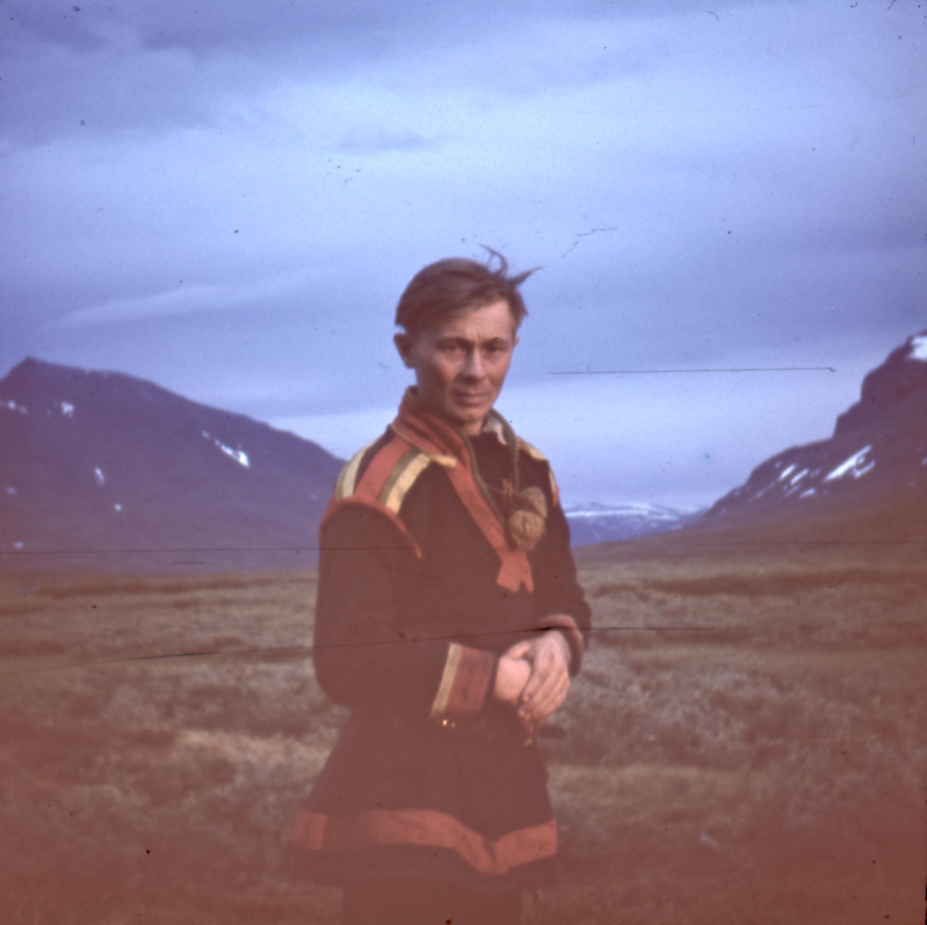 Man i jukkasjärvikolt står på fjällhed.