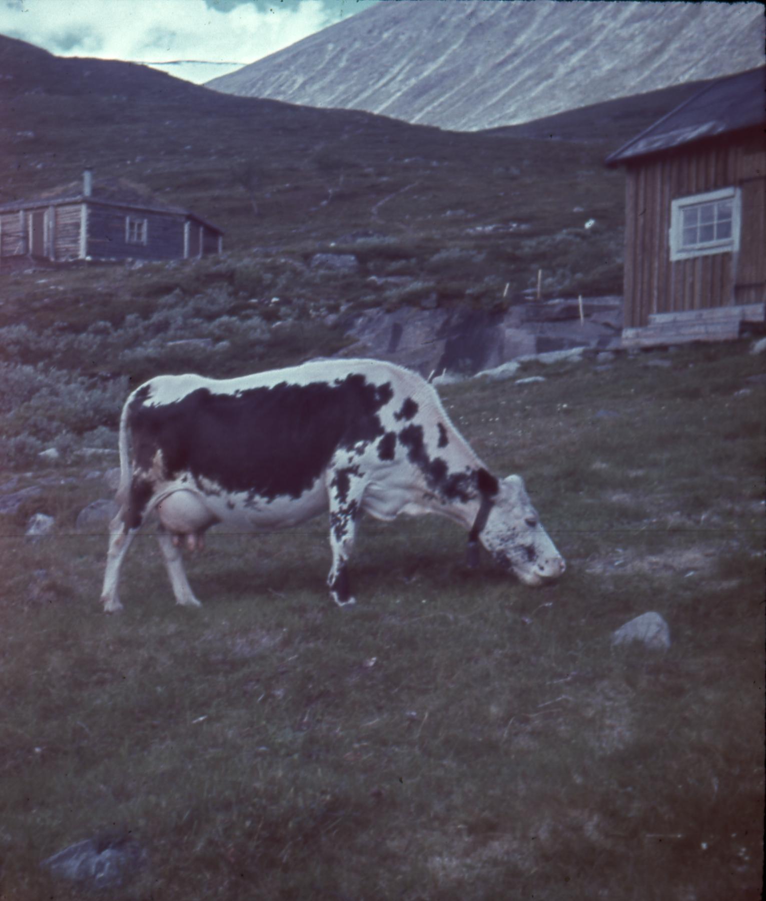 En ko, möjligtvis fjällko eller fjällnära ko, som betar på fjälläng intill två mindre byggnader.