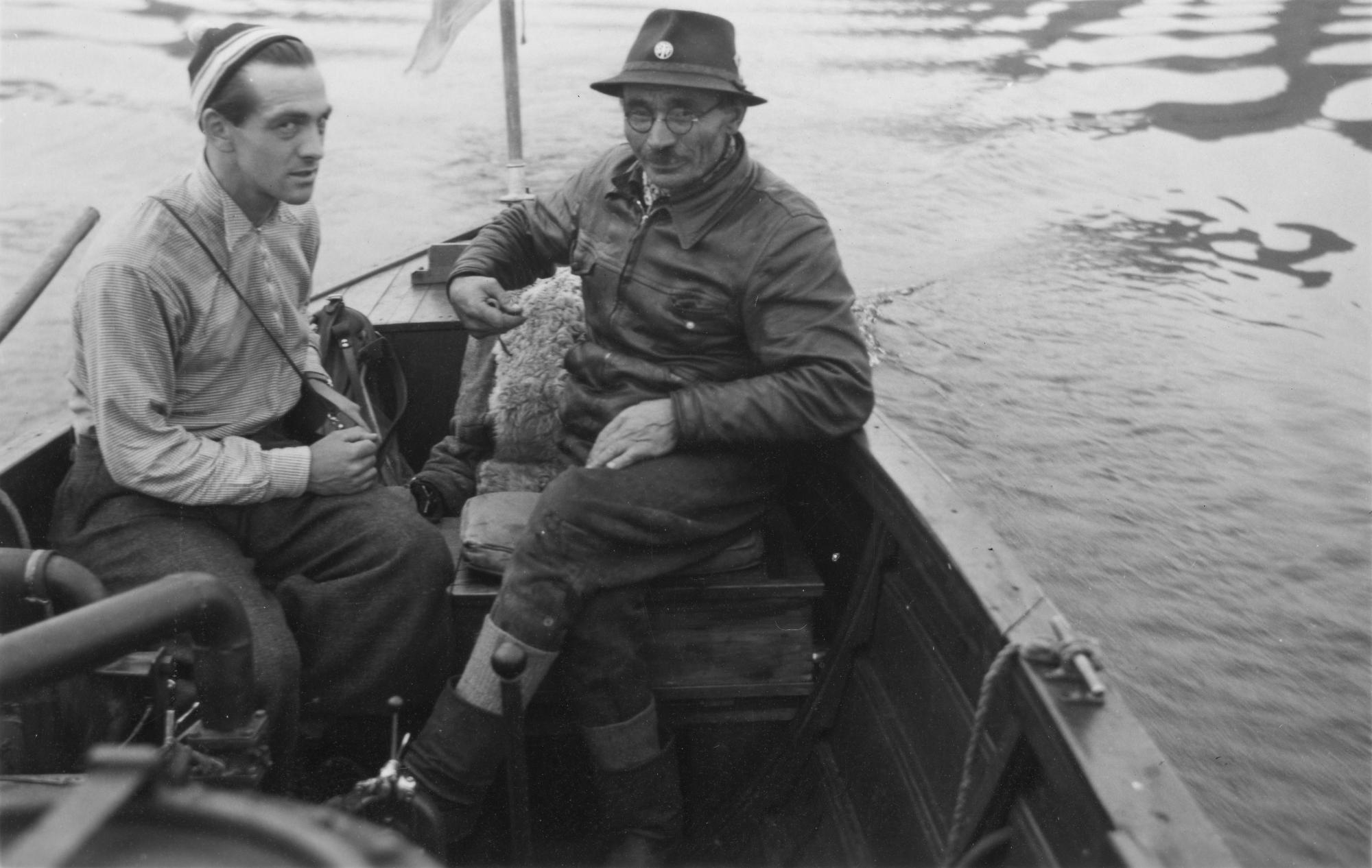 Två män sitter i motorbåt. Bakom båten syns svallvågor i vattnet.