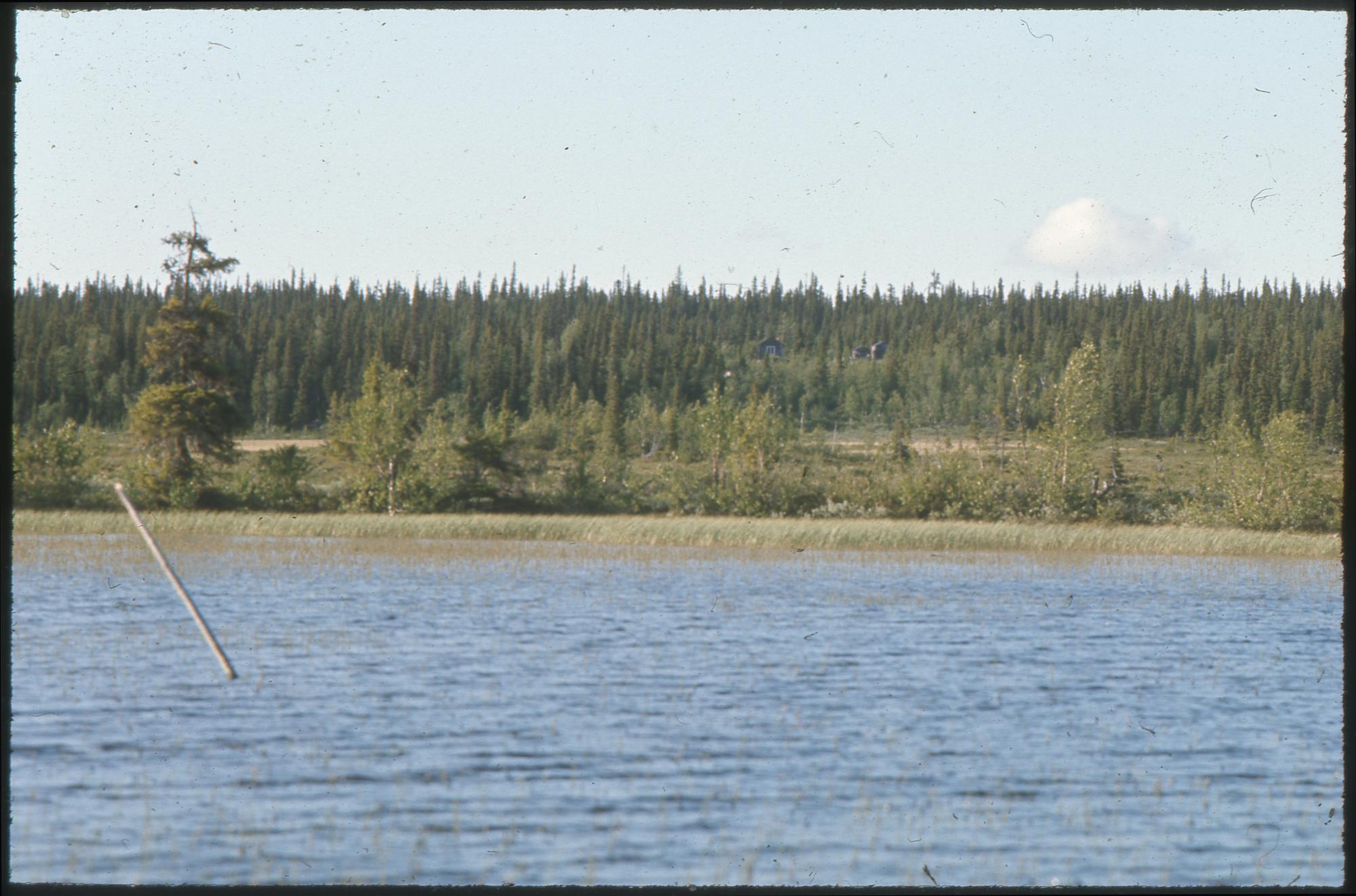 Naturbild med sjö i förgrunden där det växer gles vass. På andra sidan finns träd och skog. Bland träden i skogen kikar några stugor fram.