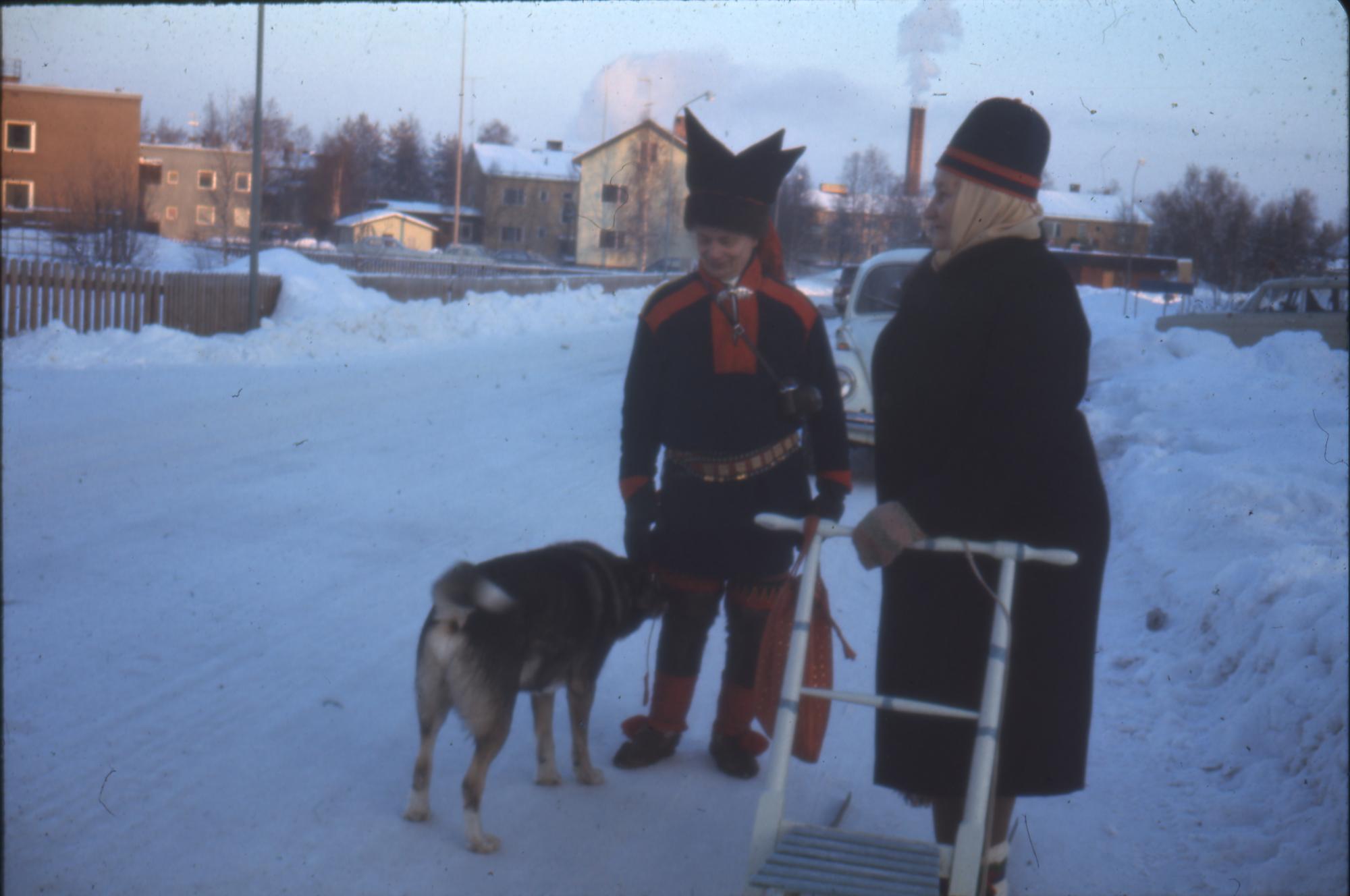 - En man och en kvinna står på en vintrig gata. Kvinnan klädd i lulesamisk kolt håller i en vit spark. Mannen med kolt från Karasjokområdet och sávka. En hund hälsar på mannen. I bakgrunden syns flera flerfamiljsbostäder.