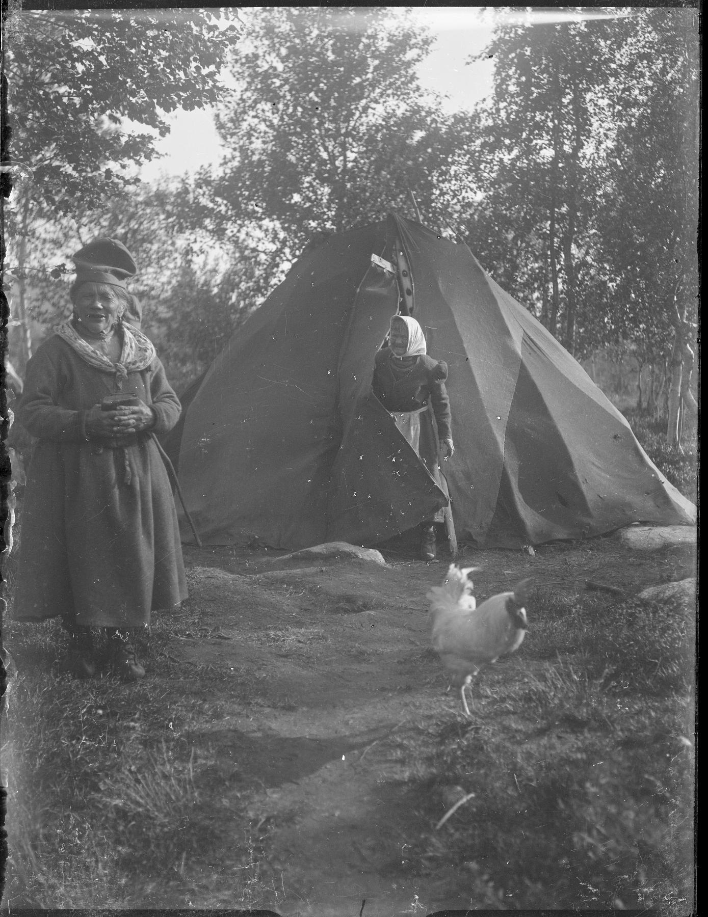 i dörröppningen till en tältkåta står en äldre kvinna klädd i en sydsamisk kolt med puffärm. I förgrunden står en annan gammal kvinna klädd i sydsamisk kolt och mössa. På bilden syns också en tupp. I bakgrunden björkar.
