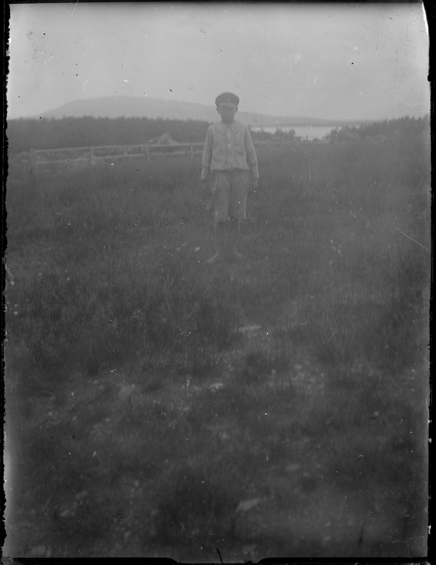 Pojke ståendes i gräs. I bakgrunden syns ett staket, stenskravel, skog, vattendrag och ett berg.
