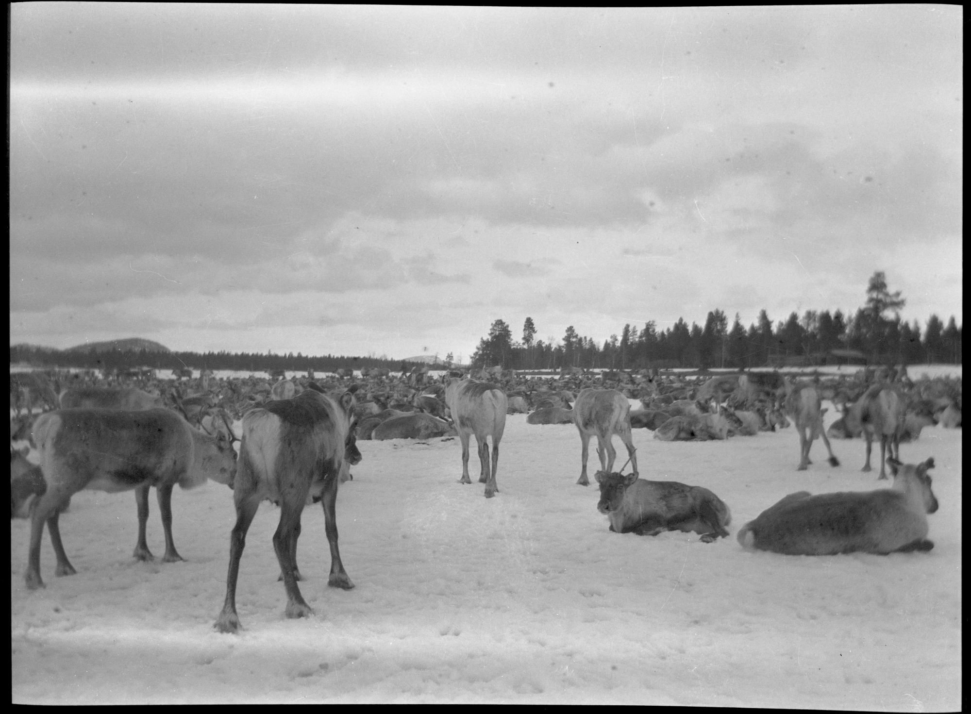 En renhjord vilar på isen invid en sjöstrand. I bakgrunden syns tallskog och bergstoppar.