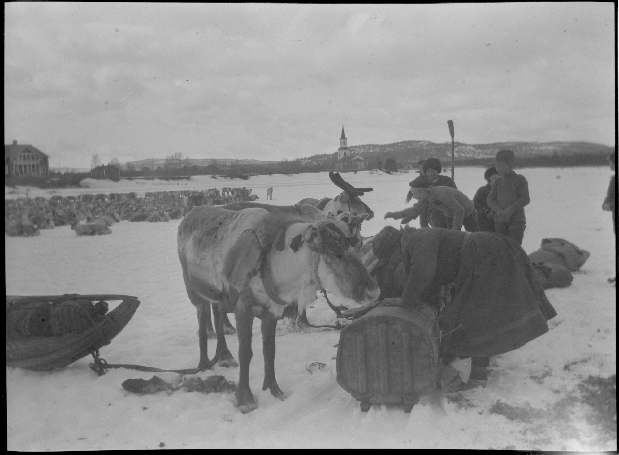 - Tre renar står invid ackjor. En kvinna lutar sig över en ackja. I bakgrunden står pojkar med en stav och hälsar på renarna. I bakgrunden syns även en renhjord som vilar på isen. På andra sidan vattendraget syns ett samhälle och en kyrka.