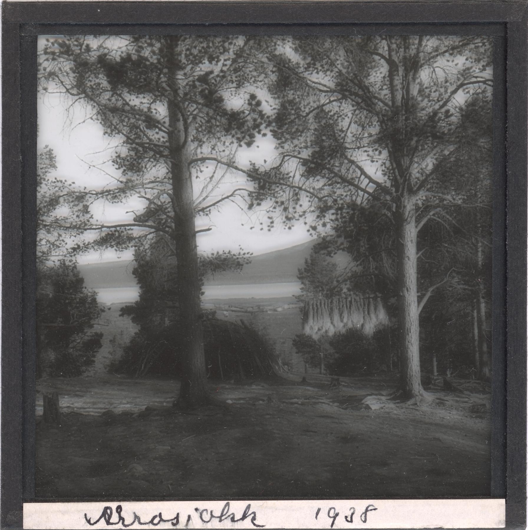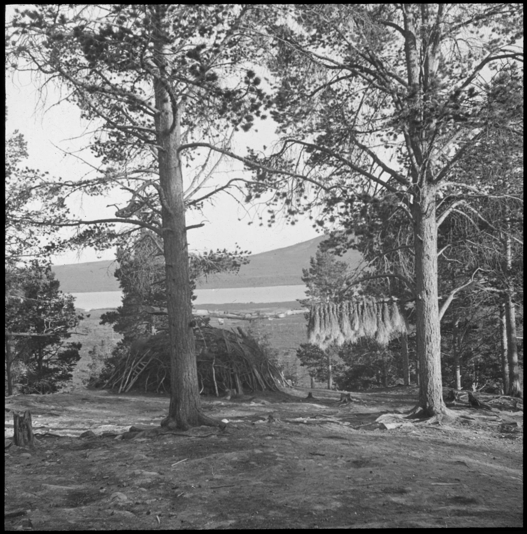 <space>En torvkåta, framför den hänger på en tall skohöflätor, bilgá, på tork. I bakgrunden ett vattendrag.