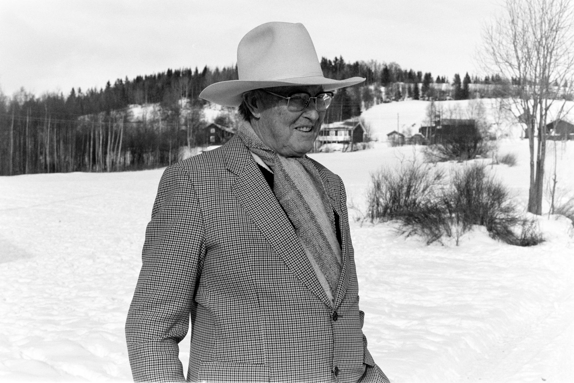 Man klädd i cowboyhatt som är kritisk till renskötseln i Härjedalen. Han vill inordna renrancher för att minska de störningar han anser finns från renar och renskötsel. Samefolket nr. 4 1993.