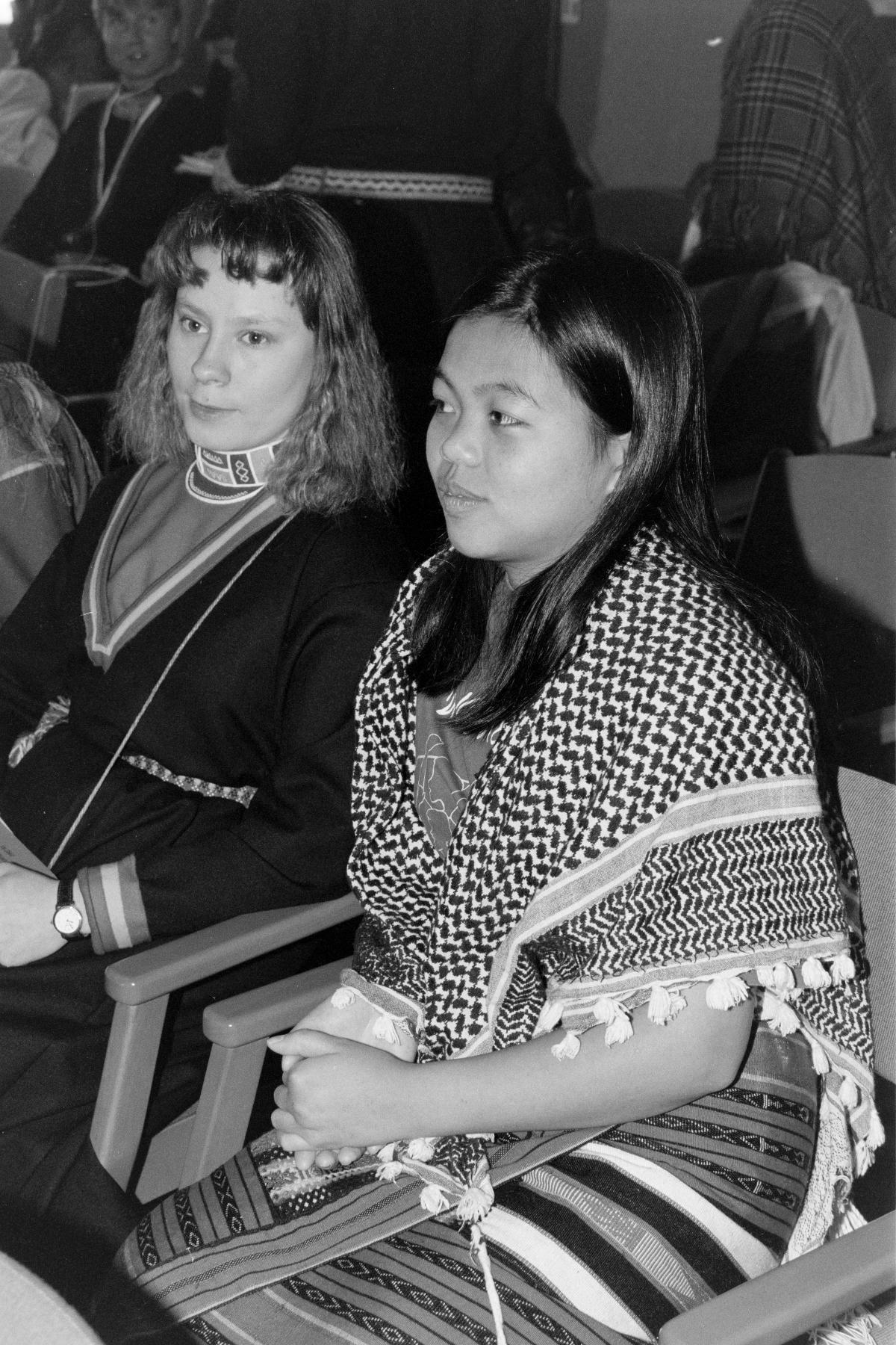 Två kvinnor på Sáminuorras förbundsmöte i Saxnäs. Kvinnan till vänster i lulesamisk. Kvinnan till höger kommer från Filippinerna. Samefolket nr. 10 1993.