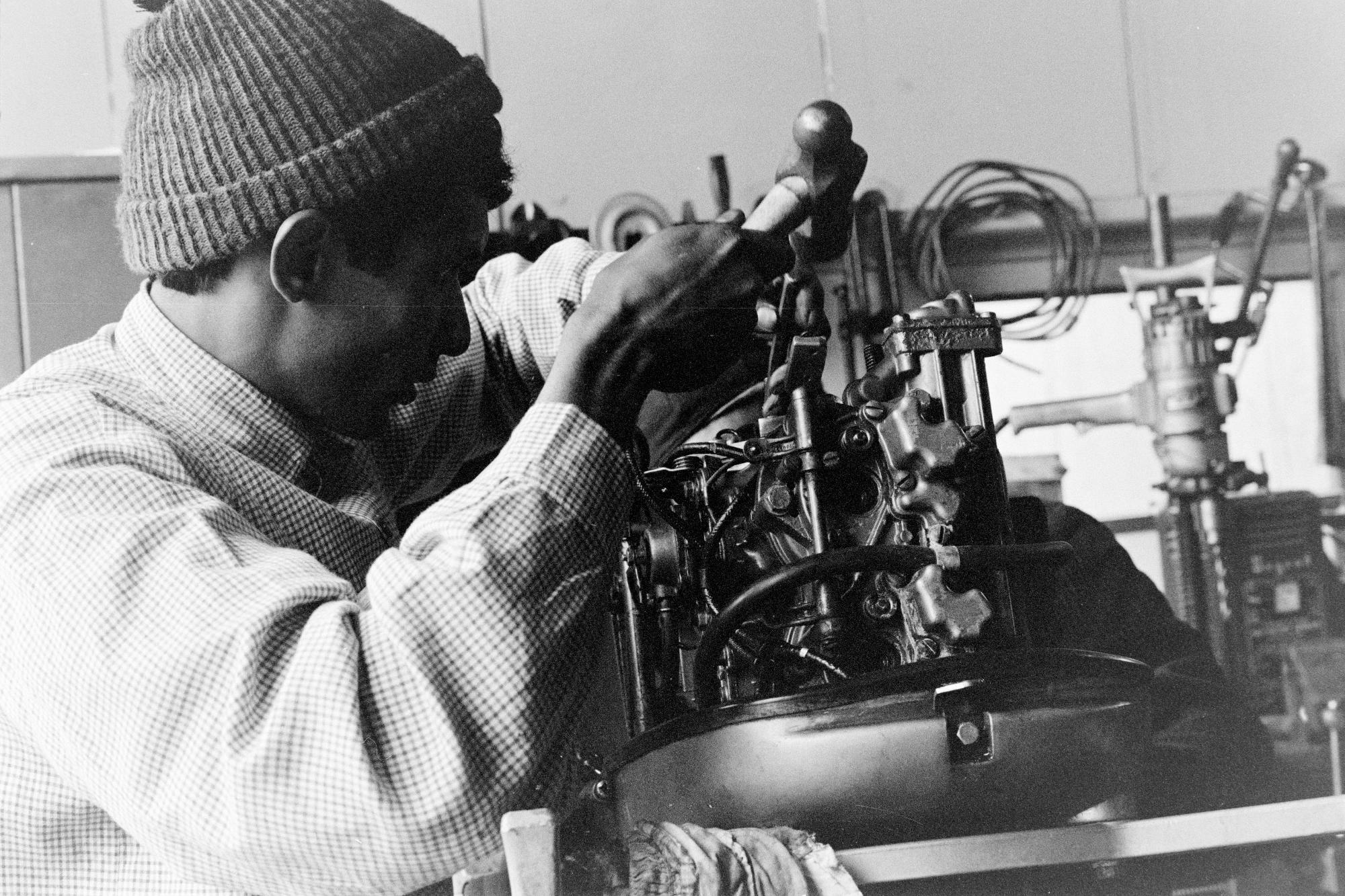 - Man reparerar båtmotor i byn Kinngait/Cape Dorset som är ett inuitsamhälle beläget på Dorset Island nära Baffinöns sydspets i Qikiqtaaluk i det kanadensiska territoriet Nunavut.