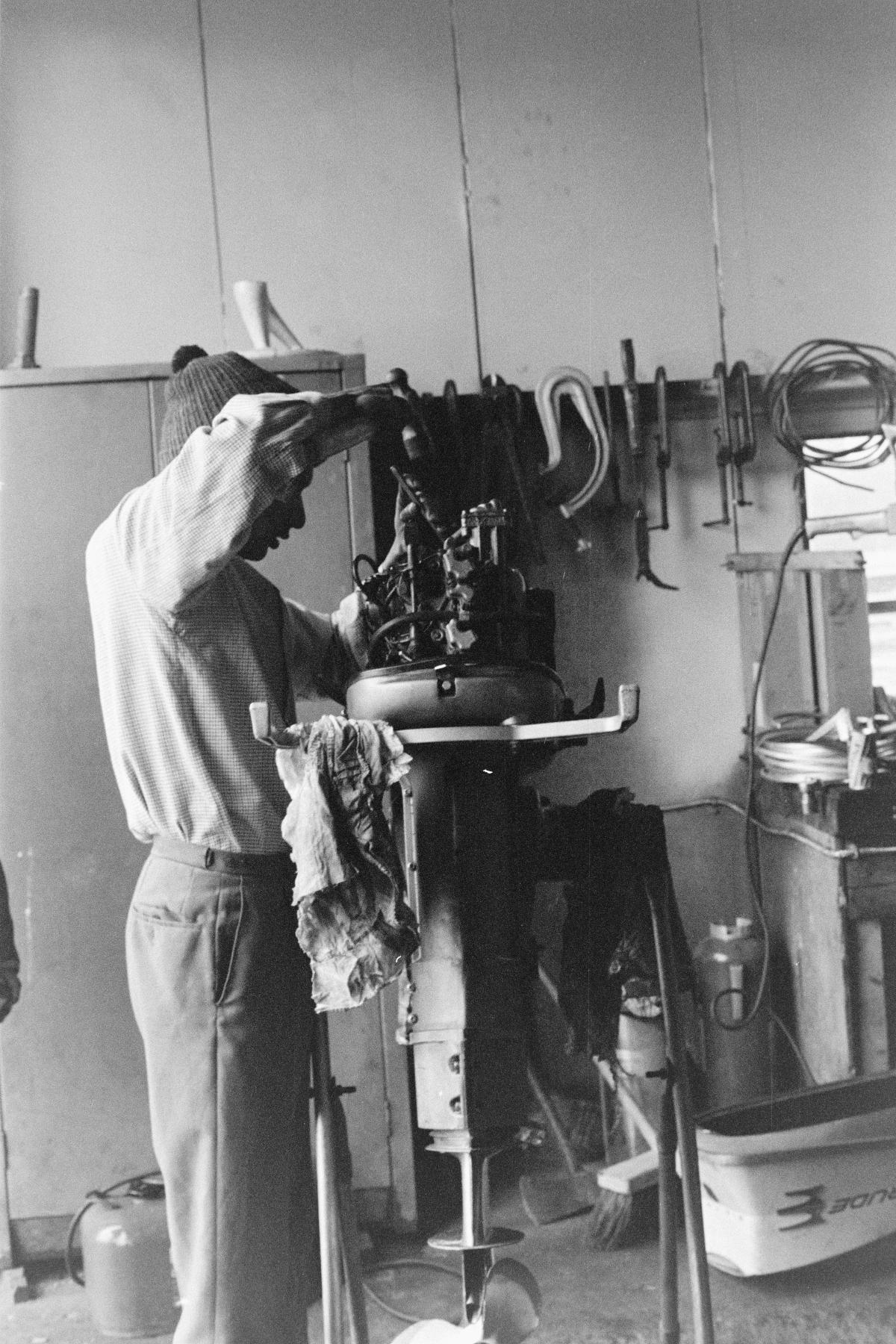 - Man reparerar båtmotor i byn Kinngait/Cape Dorset som är ett inuitsamhälle beläget på Dorset Island nära Baffinöns sydspets i Qikiqtaaluk i det kanadensiska territoriet Nunavut.
