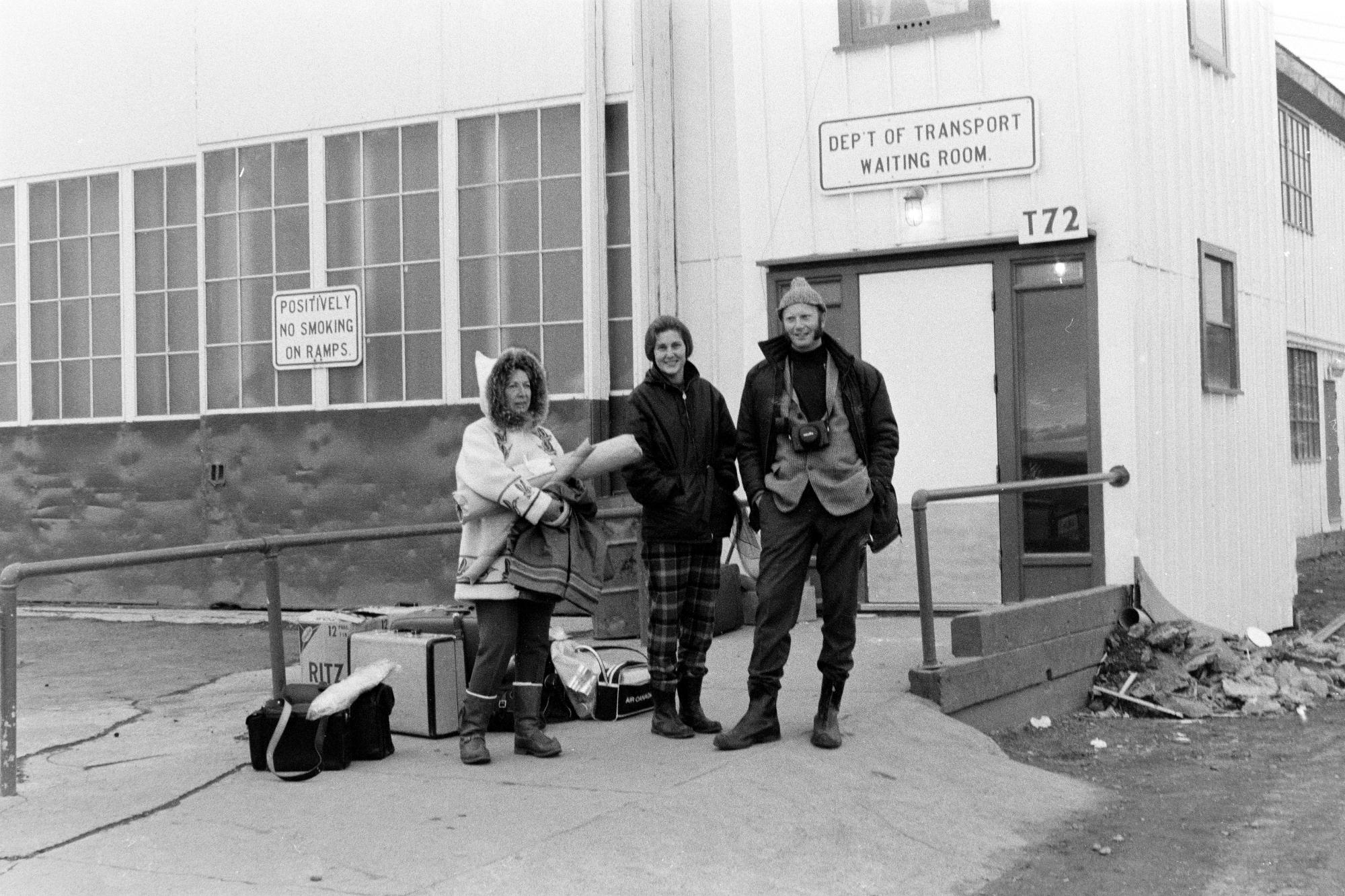 Resenärer på flygplats vid Frobisher Bay som är en by i en vik i Kanada. Byn ligger i territoriet Nunavut, i den östra delen av landet, 2 000 km norr om huvudstaden Ottawa.