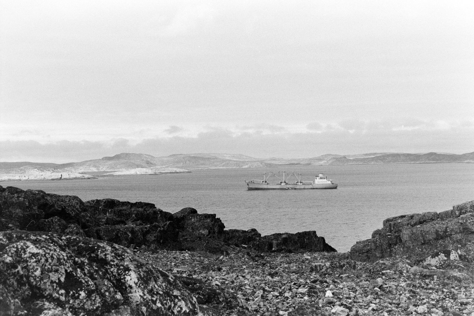 Skepp och hav vid Kinngait/Cape Dorset som är ett inuitsamhälle beläget på Dorset Island nära Baffinöns sydspets i Qikiqtaaluk i det kanadensiska territoriet Nunavut.