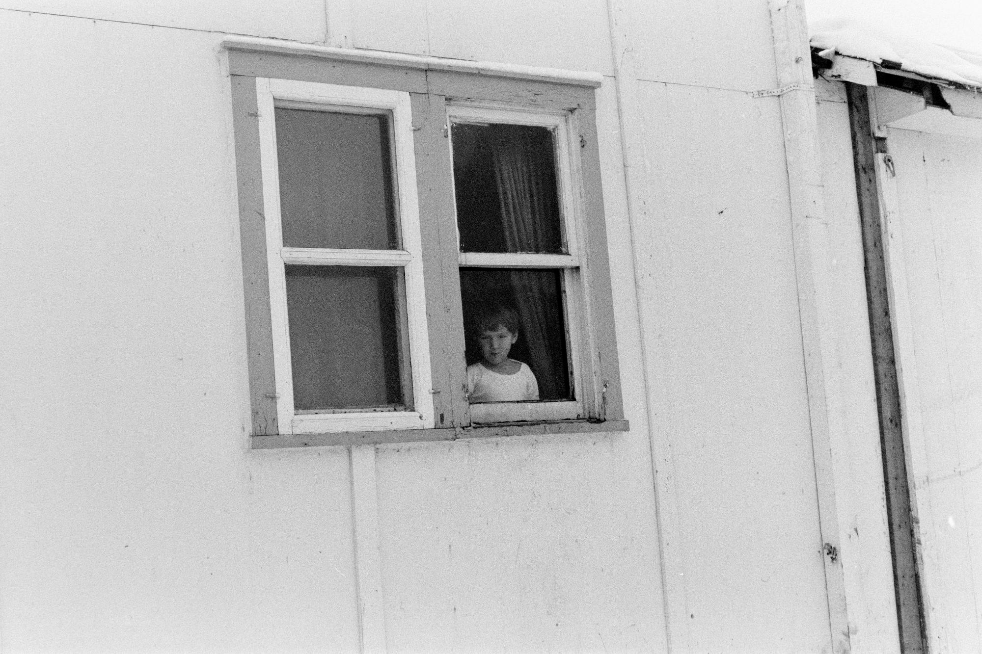 Barn tittar ut genom ett fönster i den troliga byn Schefferville i Quebec, Kanada. En plats Israel Ruong besökte med sin fru Maja.