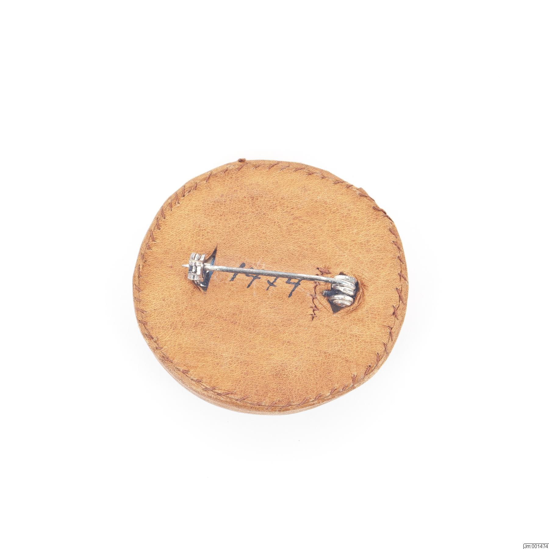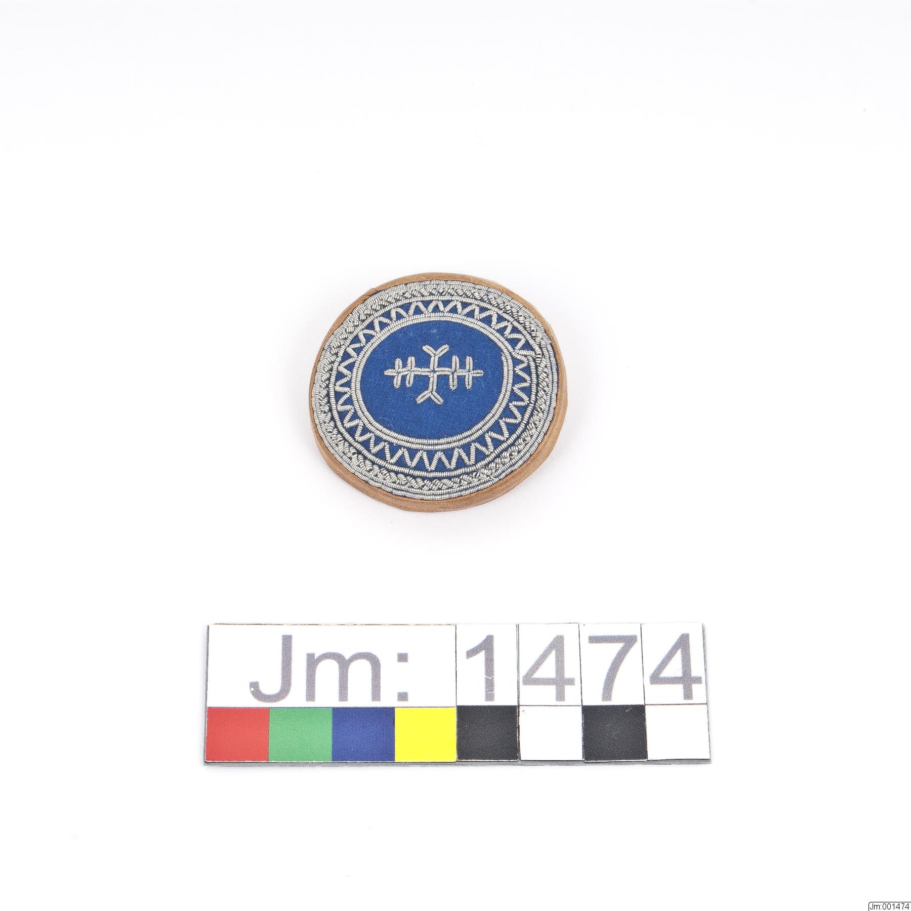 Med tennbroderier på blått kläde, på baksidan brunt läder.