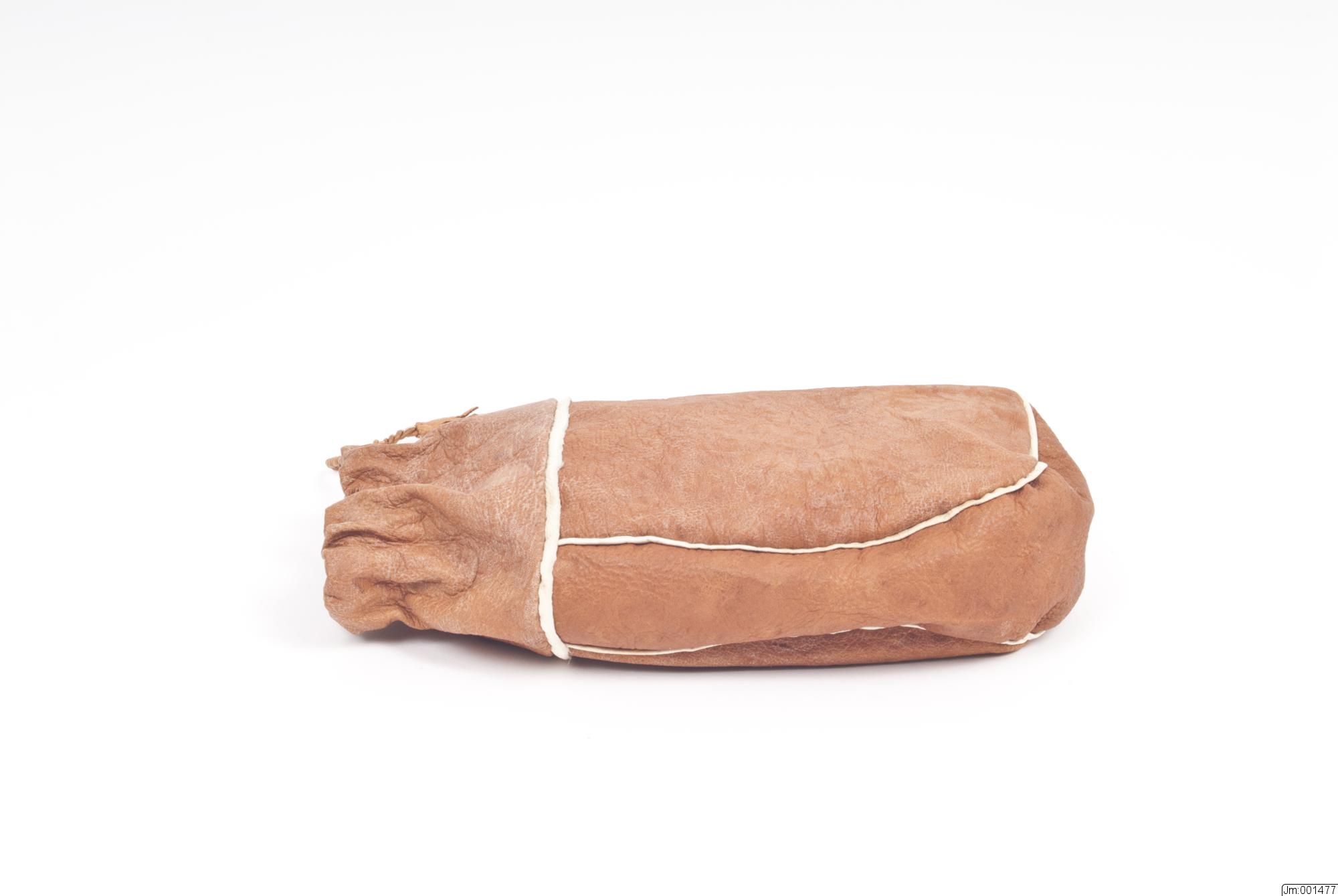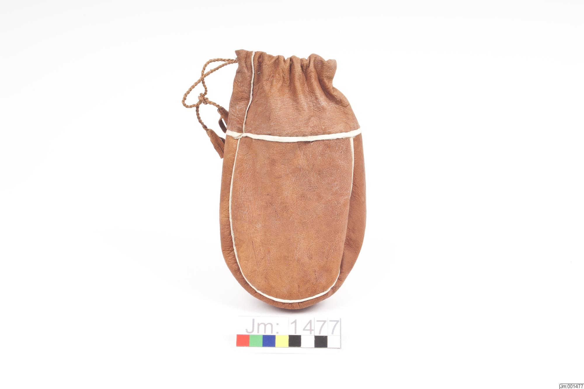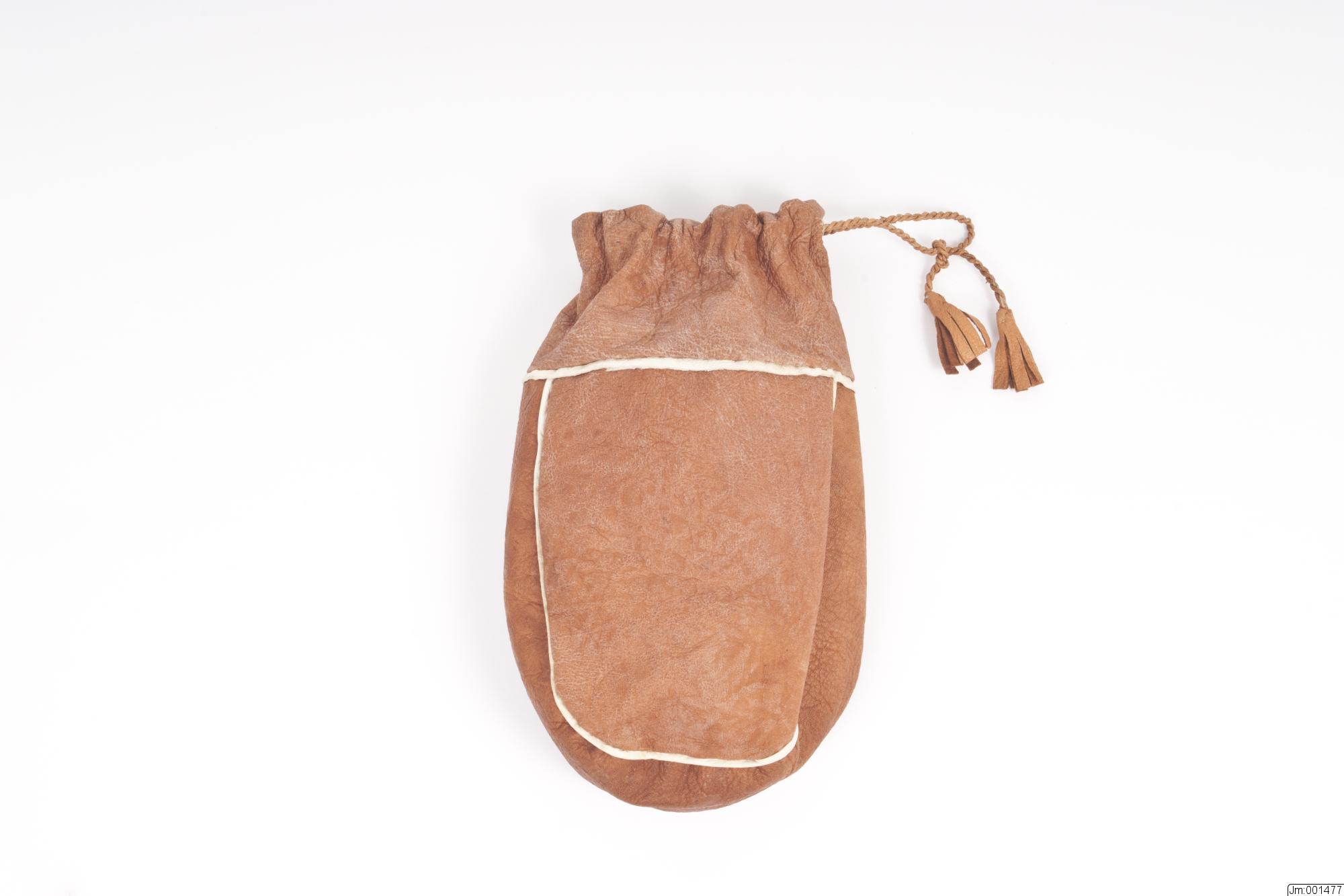 I brun färg, handsydd, försedd med dragsnodd, vitt sämskat skinn mellan sömmarna.