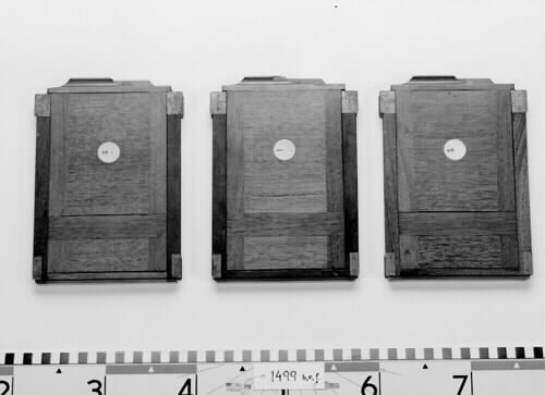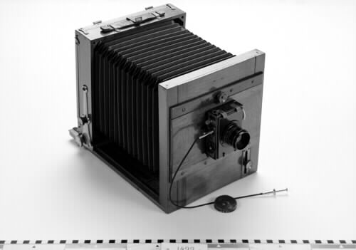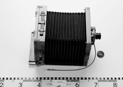 a/ Bälgkamera; kameran monterad på låda av trä med bälg i brun färg.