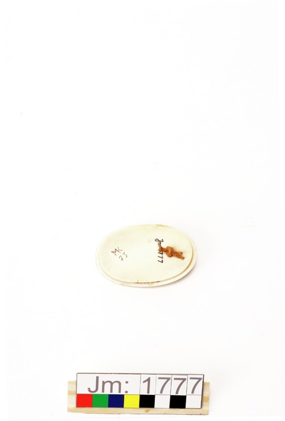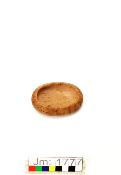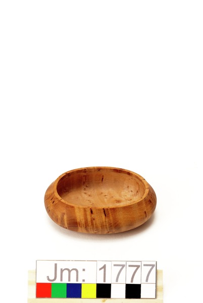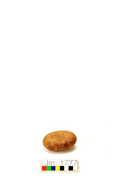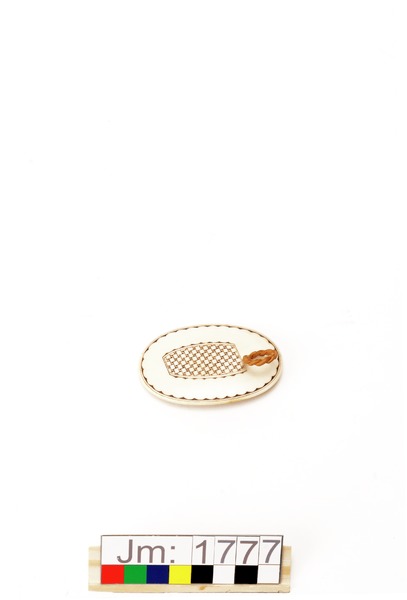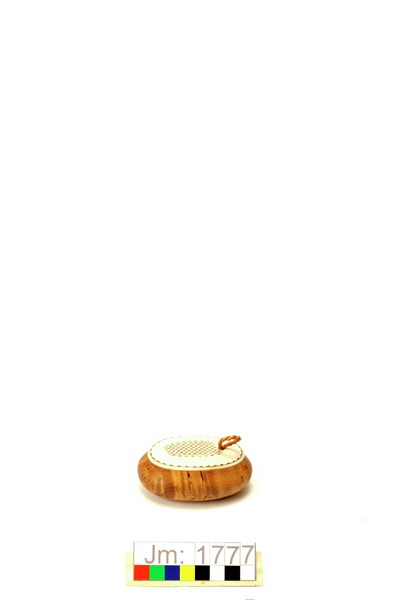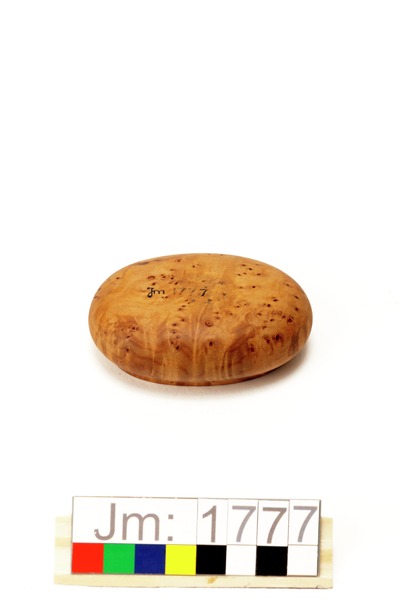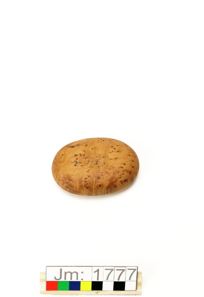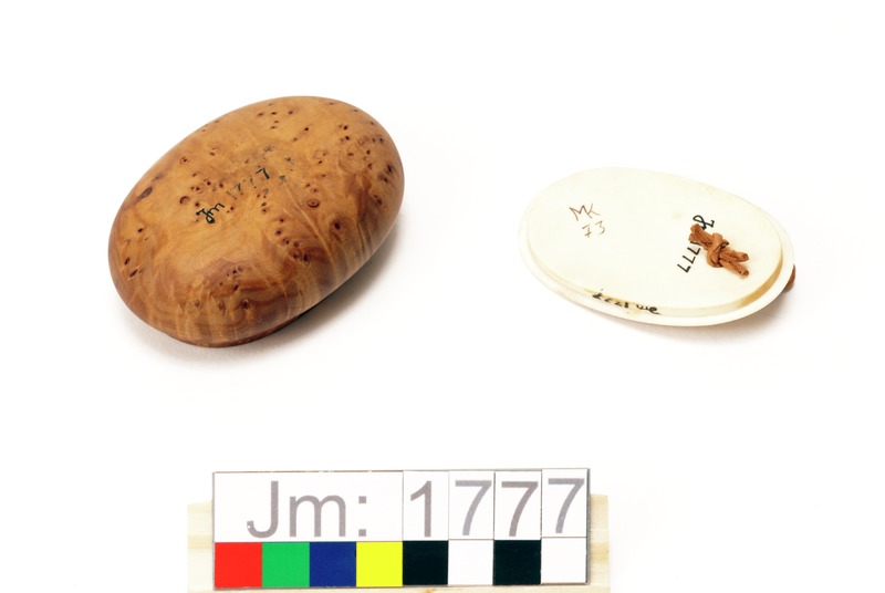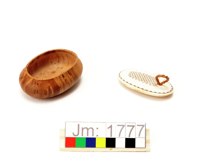 - Oval form. Själva asken är helt i trä. Locket är helt i horn. Locket graverat. Ögla av tvinnad skinnsnodd iträdd genom ett hål i locket. Tillverkarens initialer under locket. Enligt tillverkaren är dosan avsedd för snus