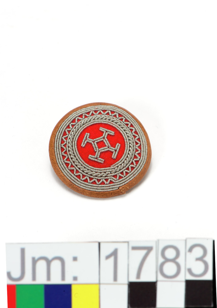 Brosch, tennbroderi på rött kläde. Skodd med barkgarvat skinn. Nål av vitmetall, fäst på broschen, en skinnbit sydd över med brun tråd.