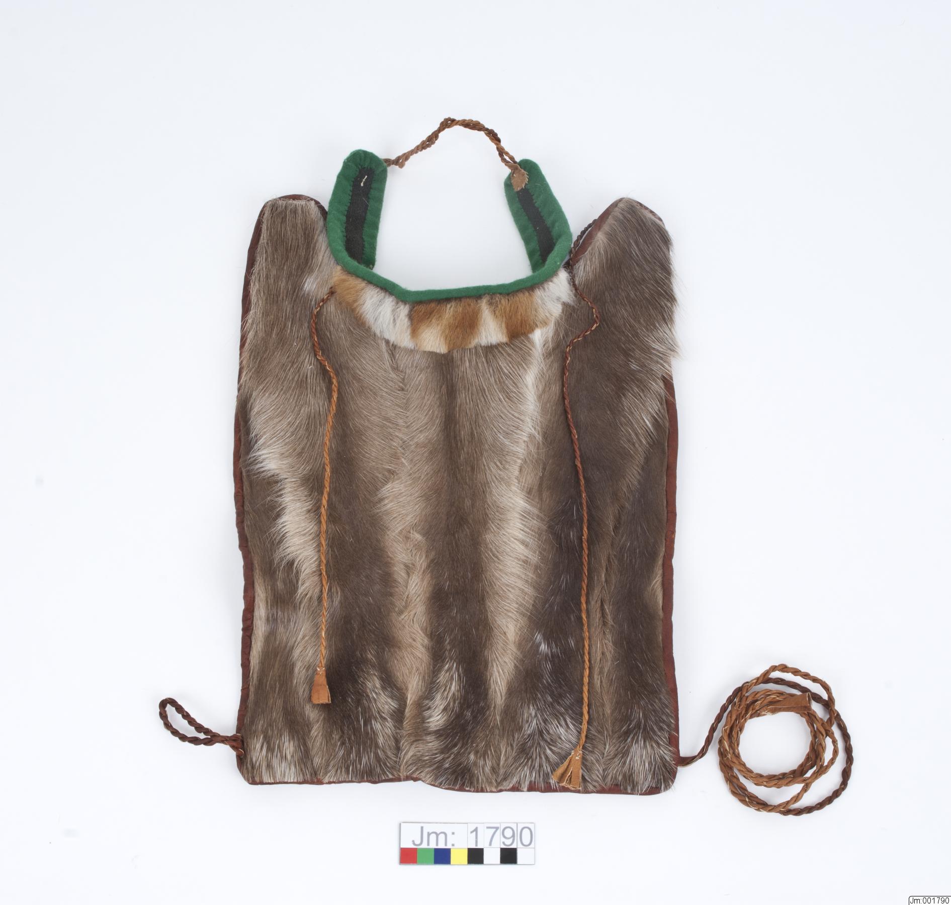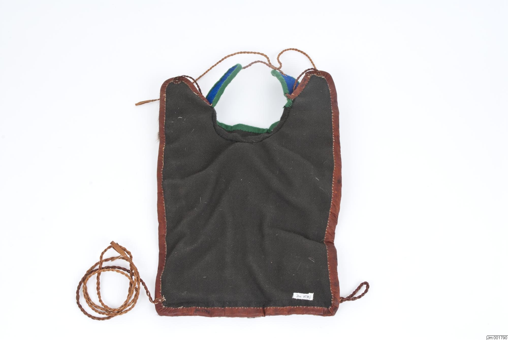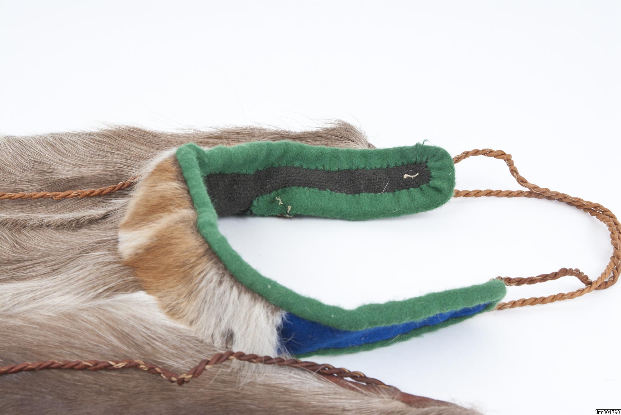 Sliehppan är fodrad med mörkbrunt ylletyg. I ena nedre hörnet en ögla tvinnad av skinn. I det andra nedre hörnet, i de två snibbarna upptill samt i halskantens ändar tvinnade skinnremmar.