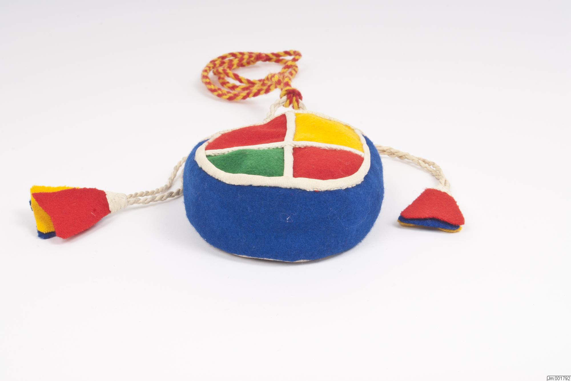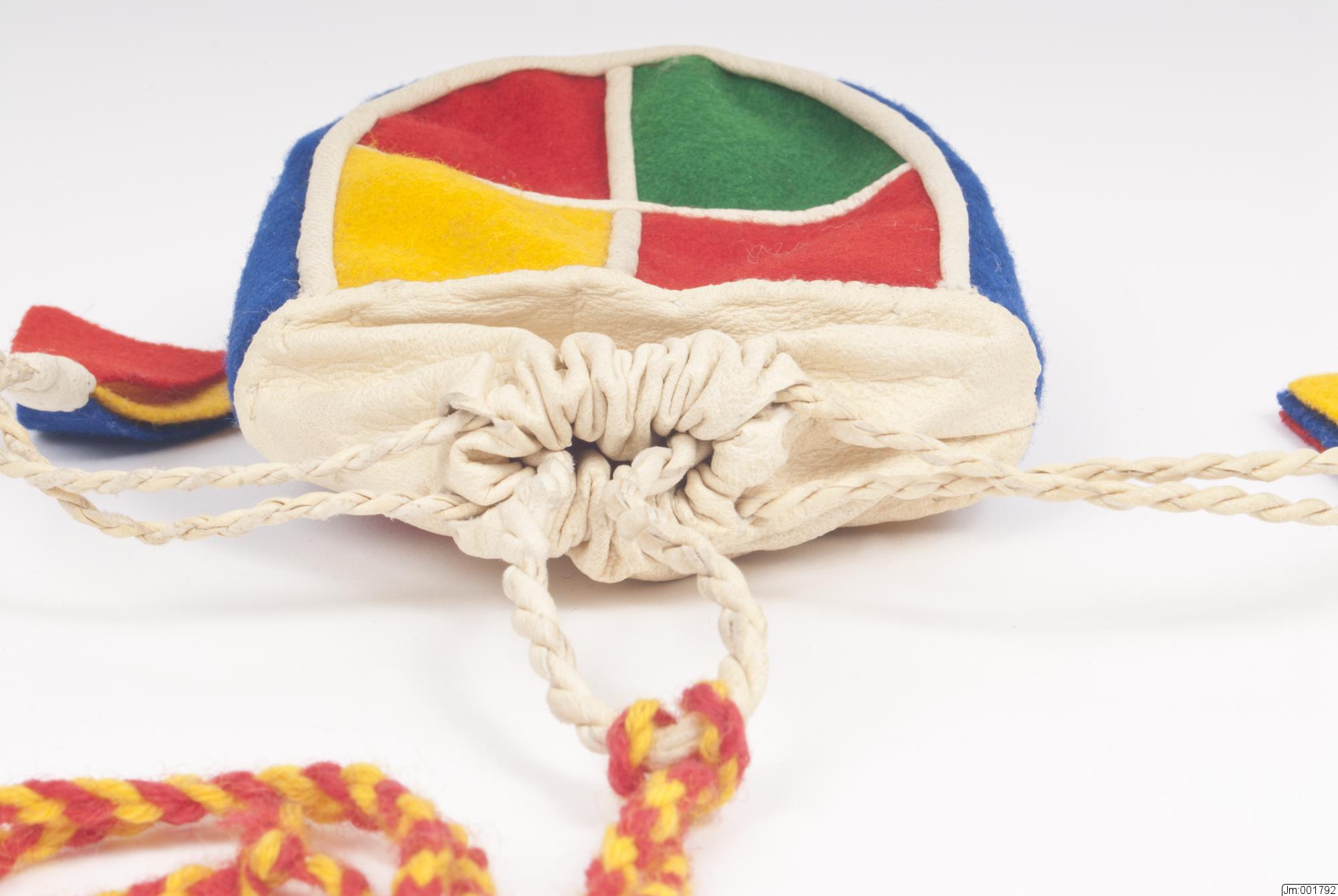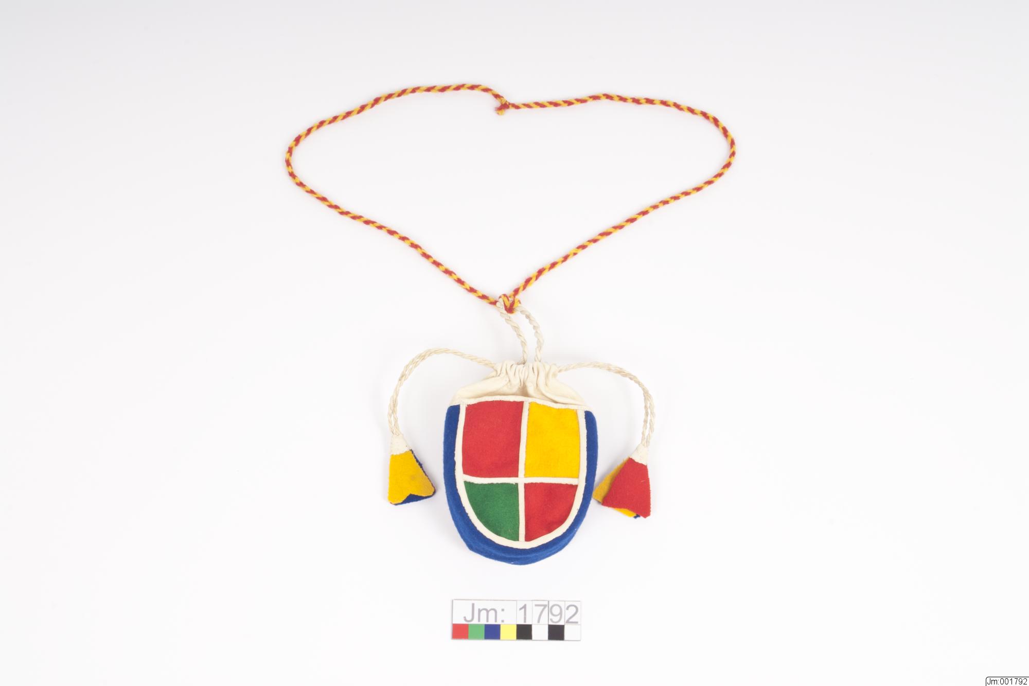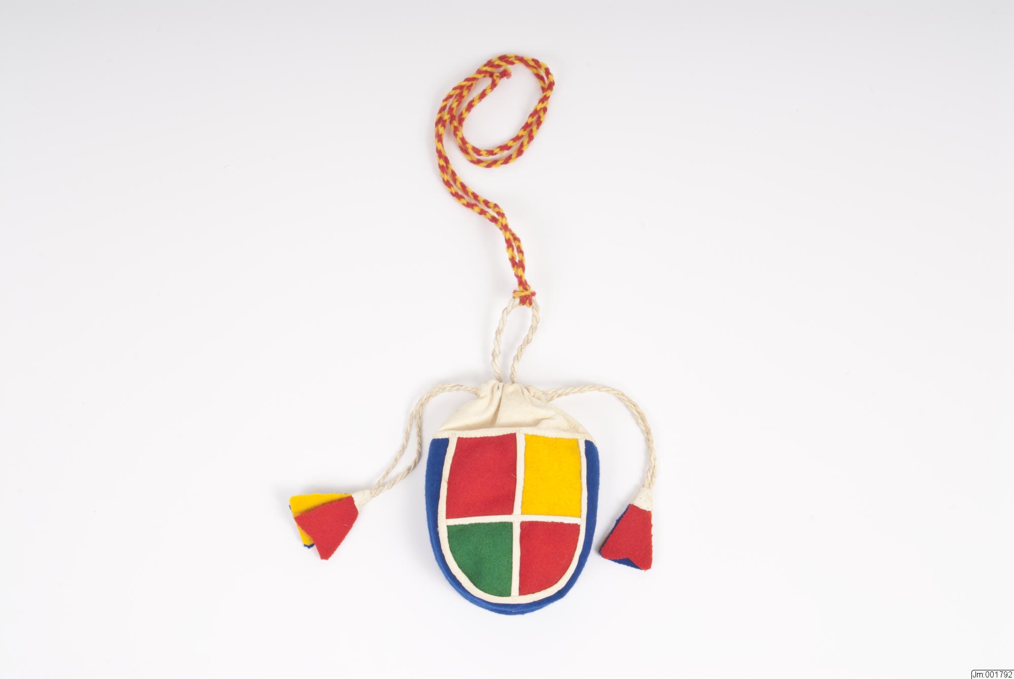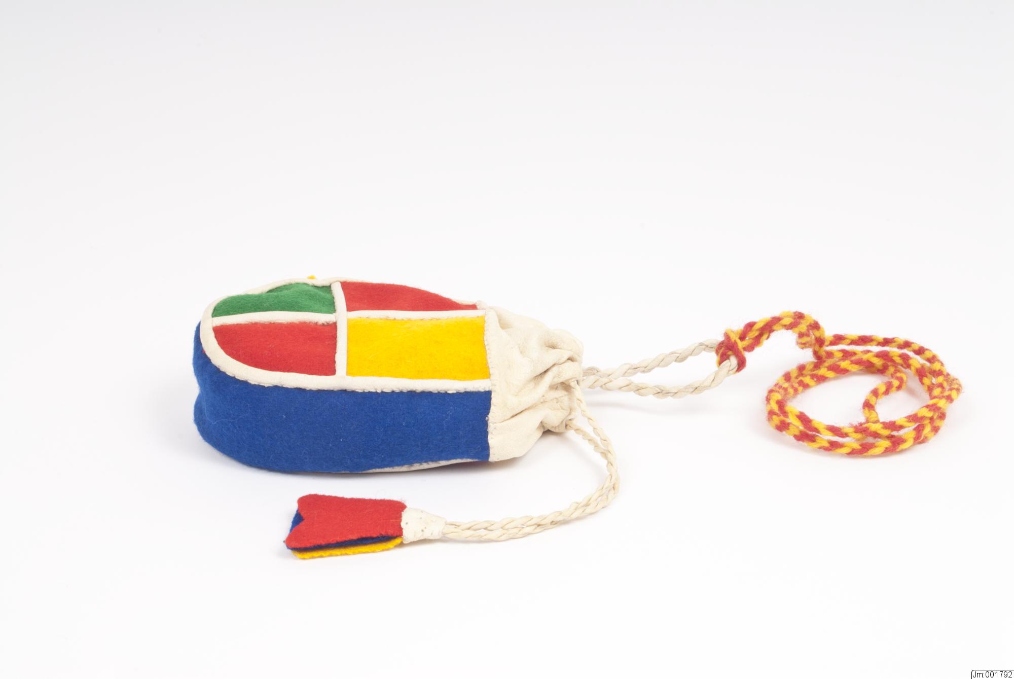 Nedre delen sydd i rutmönster i rött, gult och grönt kläde med vitt skinn mellan. Sidorna av blått kläde. Nederdelen fodrad med vitt bomullstyg. 2 vita skinnsnoddar löper i dragsko. Tofsar i rött, gult och blått kläde, skodda med vitt skinn. En skinnsnodd L 17 cm, B 0,5 cm, är fästad i pungens insida vid dragskon. I denna ögla är en röd-gul ullsnodd fästad, L 85 cm, att ha om halsen.