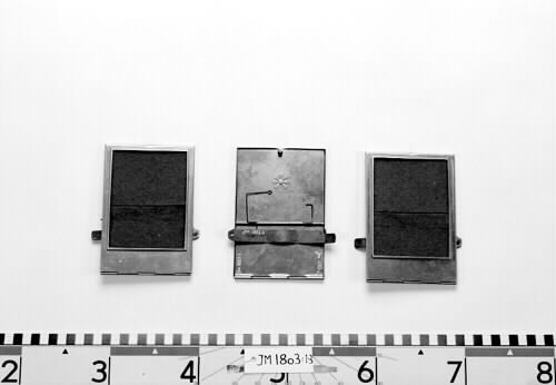 - Jm 1803:1-3. Rektangulär platta av plåt ledad med gångjärn, och fästad i plåtram genom gångjärn. Spännanordning i mässingsplåt. På plåtplattan är två filtstycken fastklistrade. Filtens färg mörkt grön. Antal: 3 stycken ramar.
