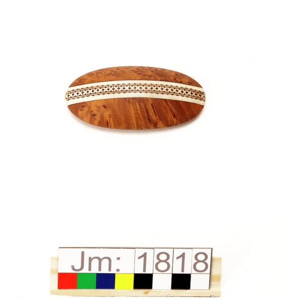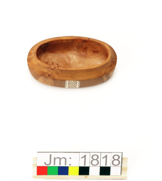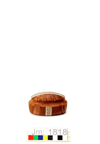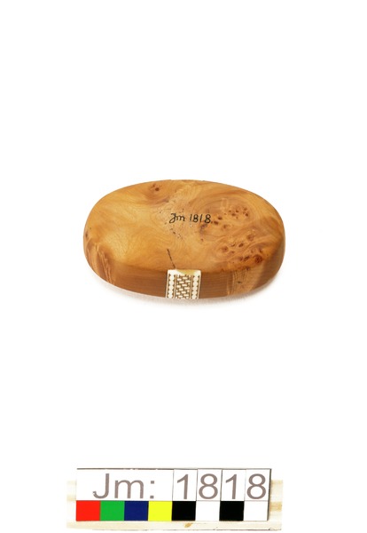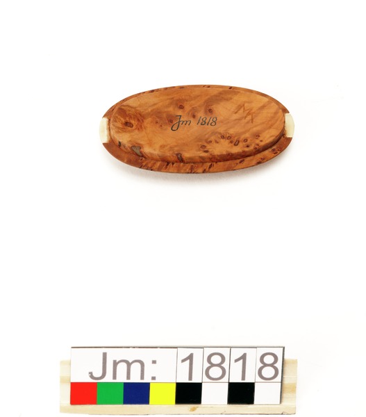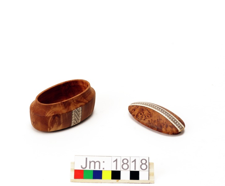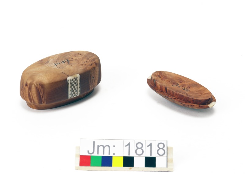 - Oval dosa med lock. Dosan i sälgrot med plan botten och på sidorna två horninläggningar, graverade med flätmönster. Locket i sälgrot har en graverad horninläggning som går tvärsöver från kortsida till kortsida. Tillverkarens initialer ingraverat i locket.
