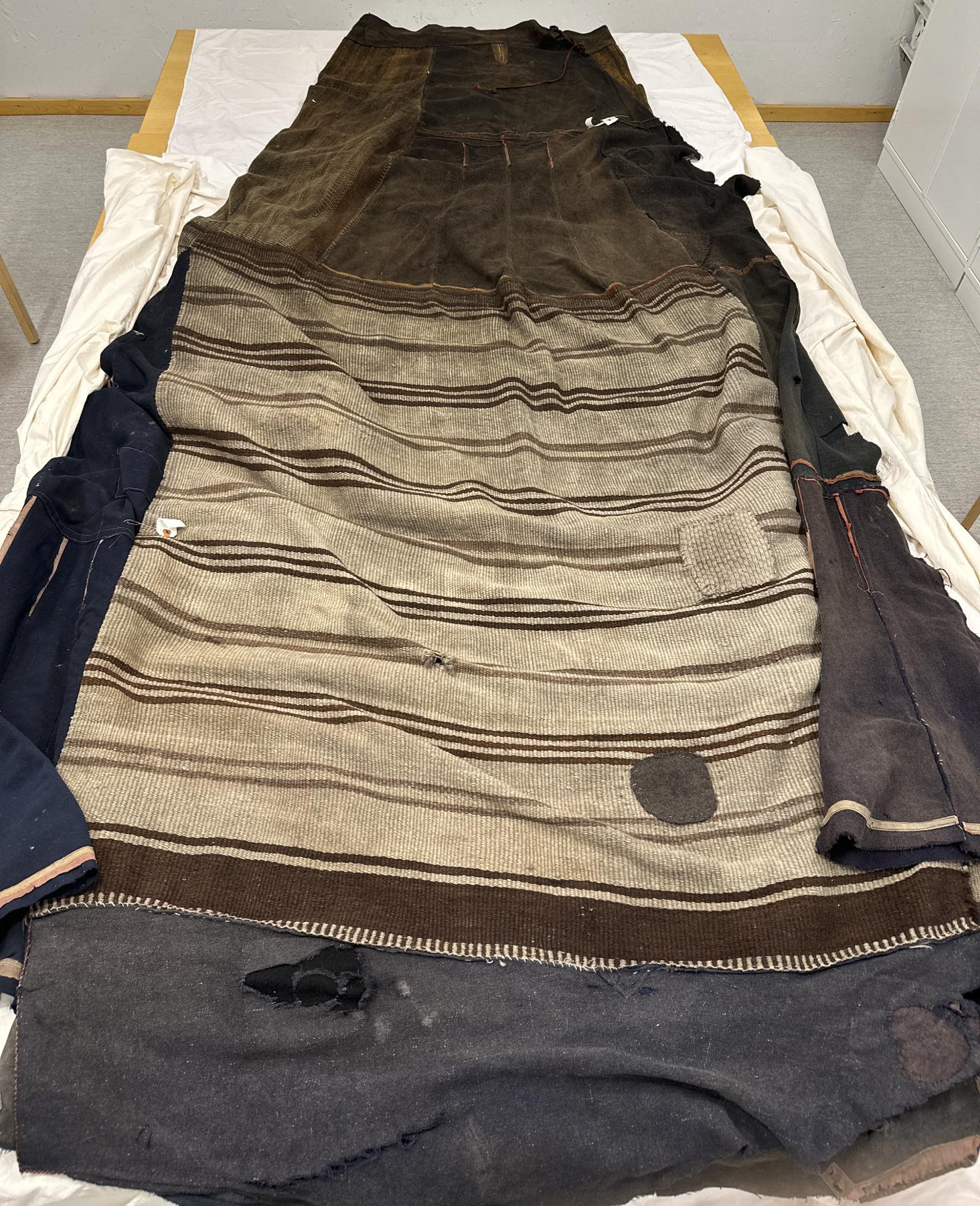 Sydd av 4 vävda ranor, skarvade med gamla koltar. På ena kanten delar av byxor. Knytband av band, skoband och vadmalsremsor.