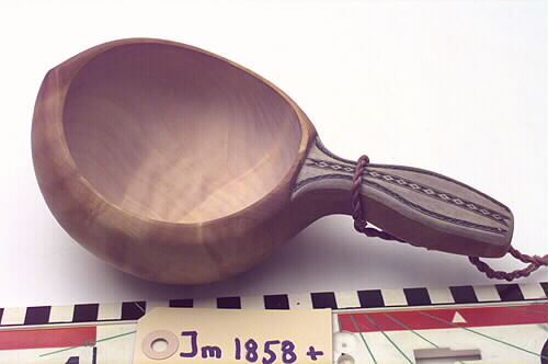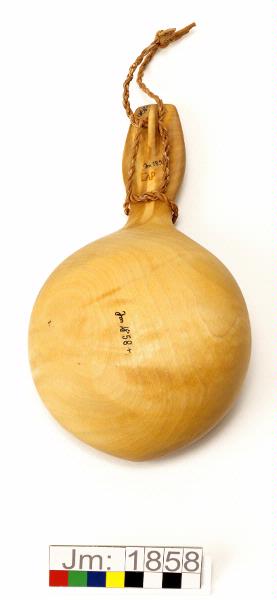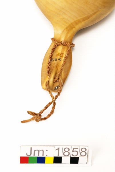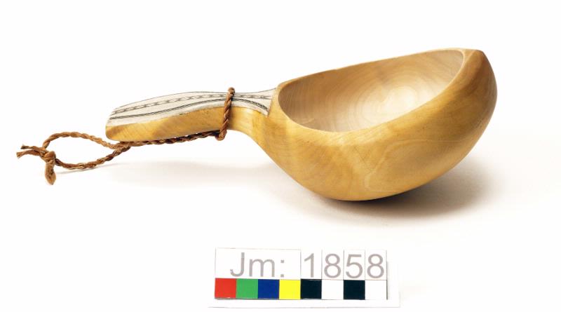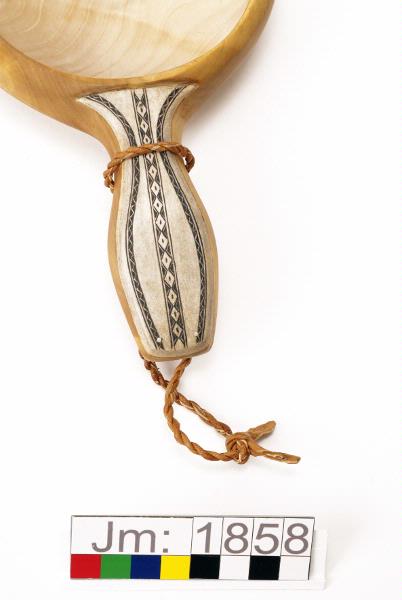 Löstagbar tvinnad lädersnodd av garvat renskinn runt skaftet, för upphängning. Utsidan och skaftet oljebehandlat.