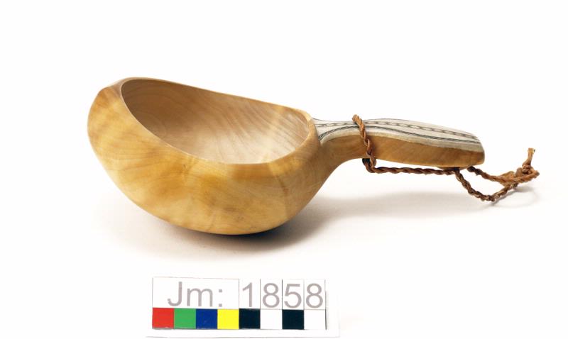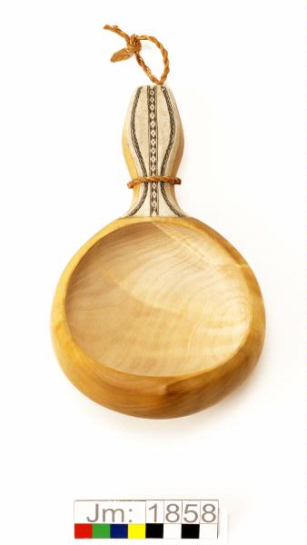 I form av en rund skopa med skaft. Skopa och skaft i björk, i ett stycke. Infälld graverad grå hornplatta på skaftet. Hornplattan fastnitad med två metallnitar. Inskriptionen på skaftets baksida: EAP.