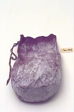 Kaffepåse. Förvaringssäck av mjukt hemgarvat skinn. Rödbrun färg. Sydd i form av en rundad påse utan lock. Vid överkanten är ett knytband av garvat skinn fastsytt. Små hål i skinnet är omsorgsfullt lagat på 5 ställen med små runda lappar.