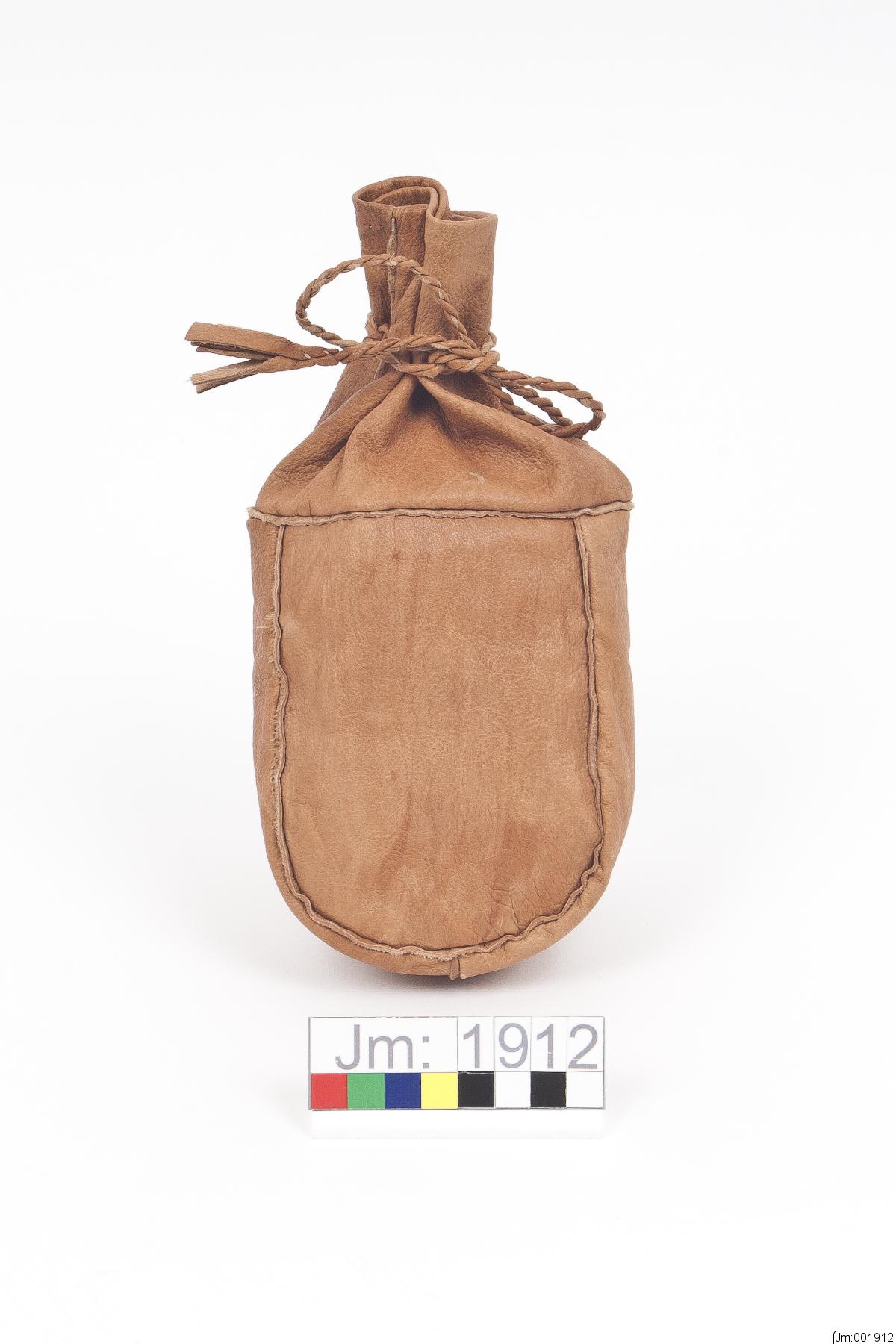 Kaffepåse i traditionell lulesamisk modell. Sydd av mjukt hemgarvat renskinn i brun färg. Mellanlägg av brunt skinn i sömmarna. 2 tvinnade snoddar med tofsar i ändarna, är fastsydda i sömmen vid påsens övre kant. Snoddarna sitt ca. 4 cm ner från kanten och är avsedda för knytning.