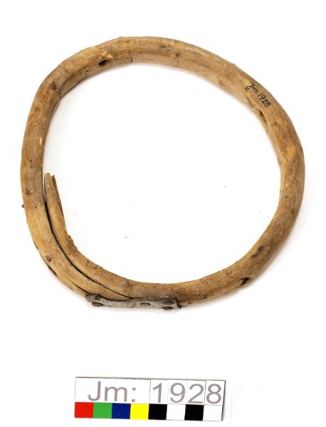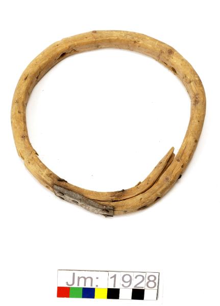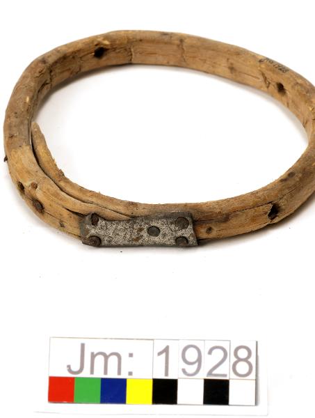 Rund form. Träet är böjt och hopspikat till en cirkel. Förstärkning av fastspikad järnplåt. 4 hål, avsedda för repanordning, runtom i träet.