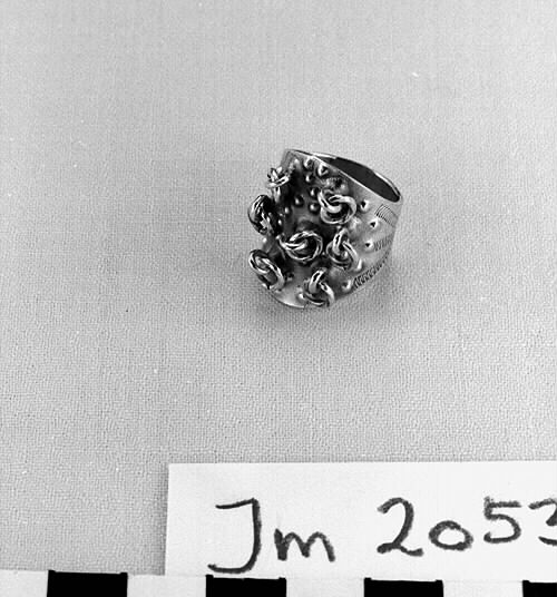 - fingerring av silver, med breddad platta som är störst på mitten. Sju små vidhängande, rörliga ringar samt slagna bucklor på plattan. Runt ringen (förutom på plattan) svisselerade ränder. Stämplar på ringens insida: på en rad: två stämplar som ej kan återges i text-923-U7. På annat ställe, vid kanten: kattfoten i en oval-S. (Importerat arbete.)
