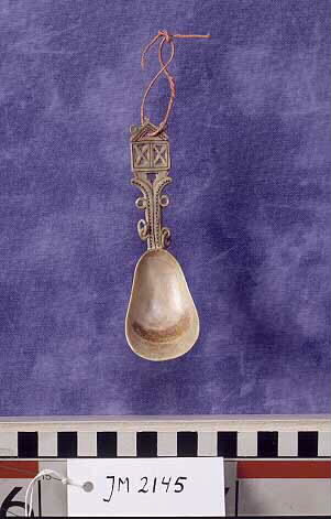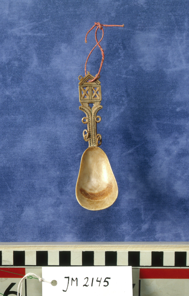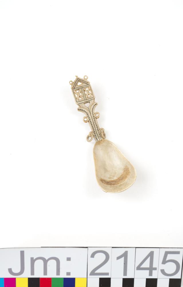 Hornsked med utsirat handtag. Översta delen av handtaget spetsigt (v-format) med två utskurna ringar i kanten överst. Formen fyrkantig med en triangel överst (som ett hus med v-format tak). Längs kanten längre ned på skaftet: två utskurna ringar i vardera sidan. I de två ringarna närmast skedbladet (på vardera sidan) finns en hornring, sammanlagt 2 stycken. Skaftet graverat. Päronformat skedblad.
