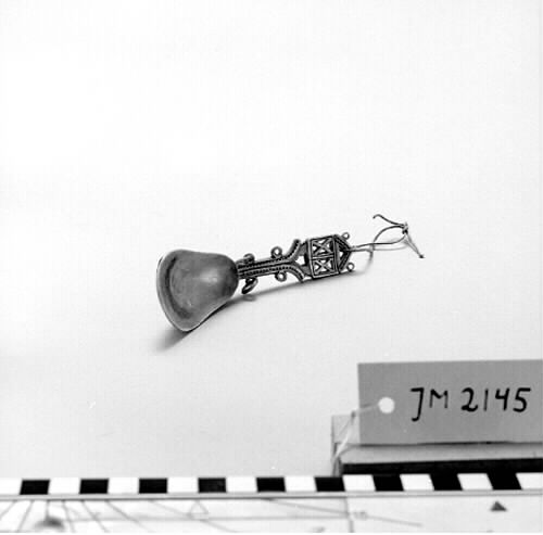 - Hornsked med utsirat handtag. Översta delen av handtaget spetsigt (v-format) med två utskurna ringar i kanten överst. Formen fyrkantig med en triangel överst (som ett hus med v-format tak). Längs kanten längre ned på skaftet: två utskurna ringar i vardera sidan. I de två ringarna närmast skedbladet (på vardera sidan) finns en hornring, sammanlagt 2 stycken. Skaftet graverat. Päronformat skedblad.