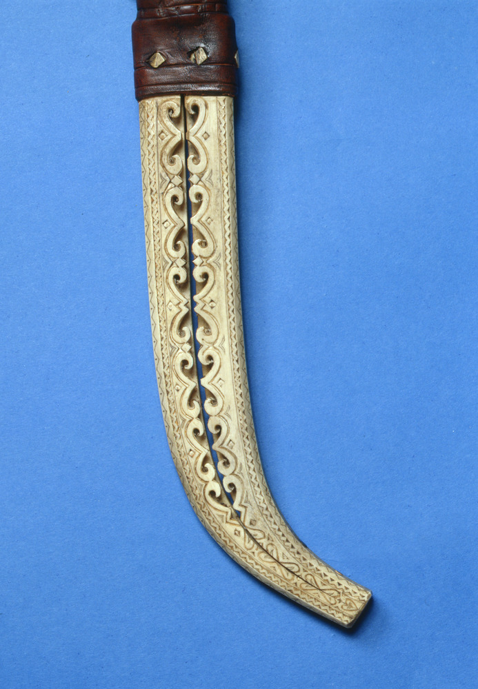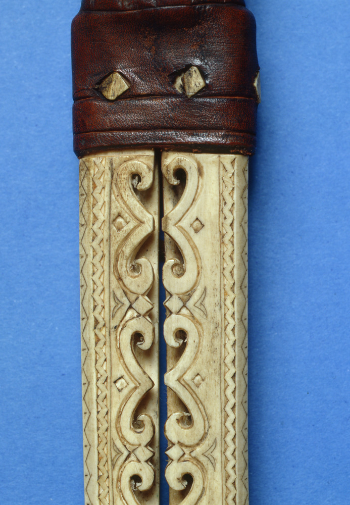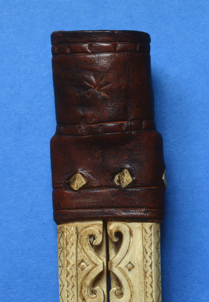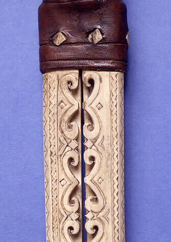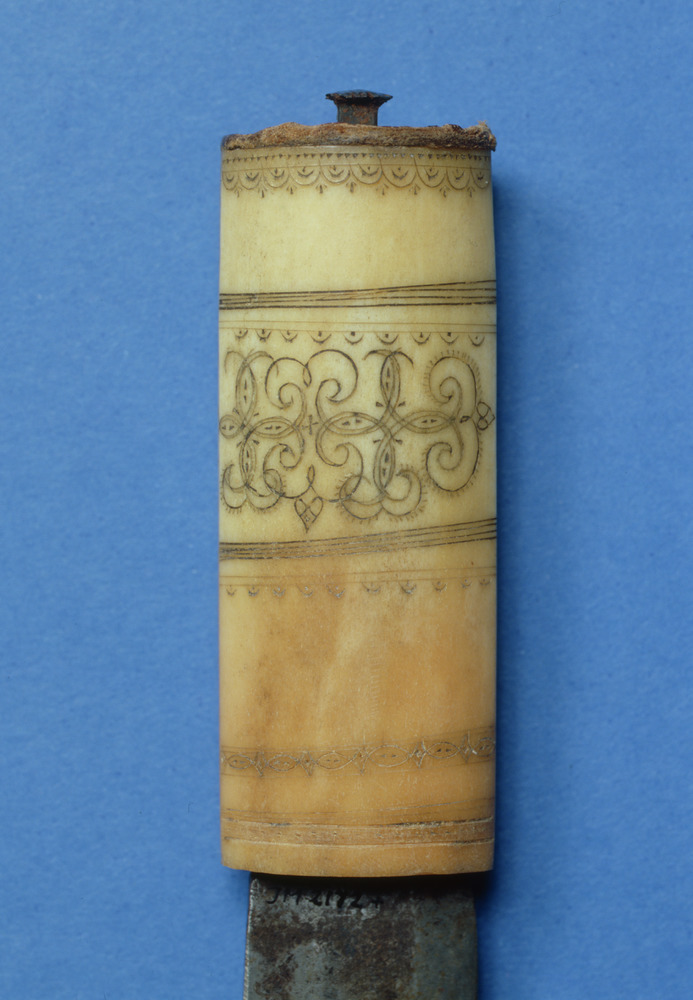 Knivens skaft av horn. Skaftet är graverat. På ena sidan är en slaktscen graverad, med en man och en ren som lagts på rygg. På andra sidan ett sorts blommönster. Överst på skaftet är en näverbit fastsatt.