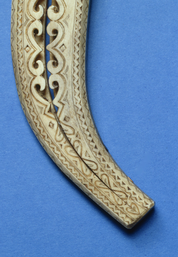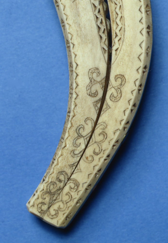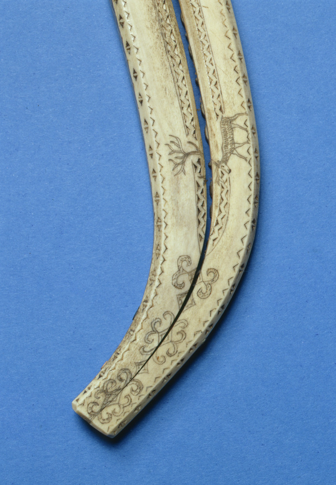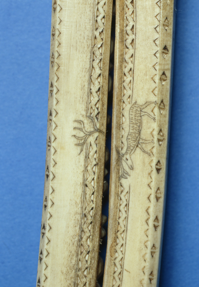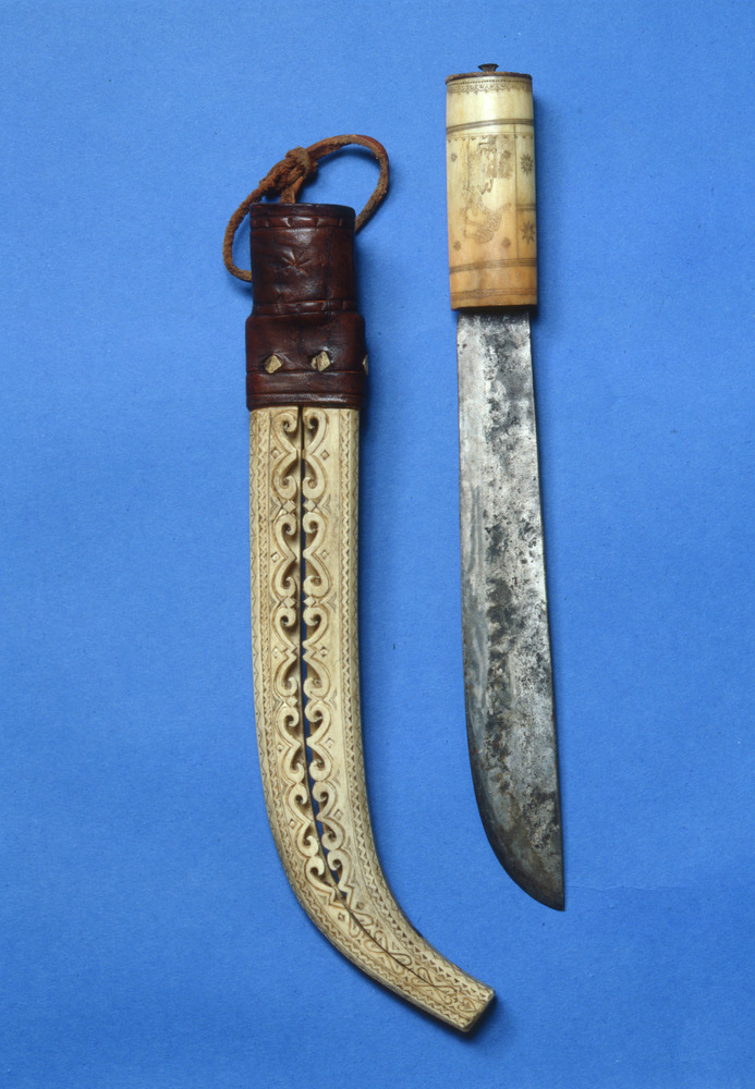 Knivens skaft av horn. Skaftet är graverat. På ena sidan är en slaktscen graverad, med en man och en ren som lagts på rygg. På andra sidan ett sorts blommönster. Överst på skaftet är en näverbit fastsatt.
