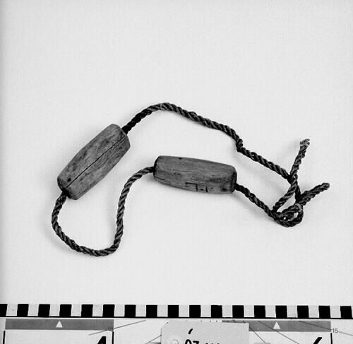Del av nätteln med "flytträklossar" i trä. På en "kloss" (2) är det en signatur IL. Nättelnen är väldigt fin och välgjord. På 4 ställen sitter en del av (hamp?)snöre kvar från nätet.