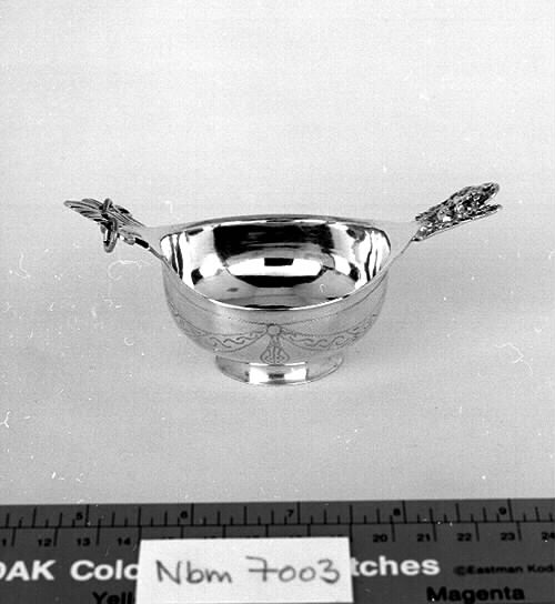 - Halvklotformad. Två nästan vågräta handtag, det ena i form av en ängel, från det andra hänger två ringar. Låg rund fot. Invändigt, samt handtagens ovansida, förgylld. Graverad dekor på utsidan i form av girlander (svisselerat). Stämplar: U 3-Luleå stadsstämpel-tre kronor-0:F.