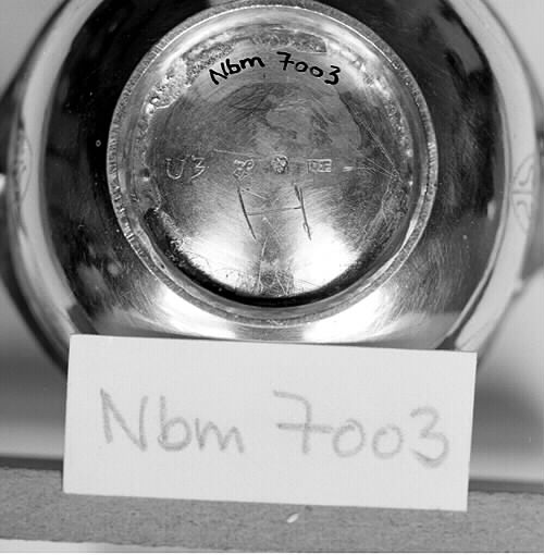 - Halvklotformad. Två nästan vågräta handtag, det ena i form av en ängel, från det andra hänger två ringar. Låg rund fot. Invändigt, samt handtagens ovansida, förgylld. Graverad dekor på utsidan i form av girlander (svisselerat). Stämplar: U 3-Luleå stadsstämpel-tre kronor-0:F.