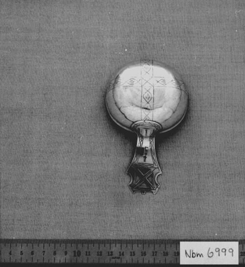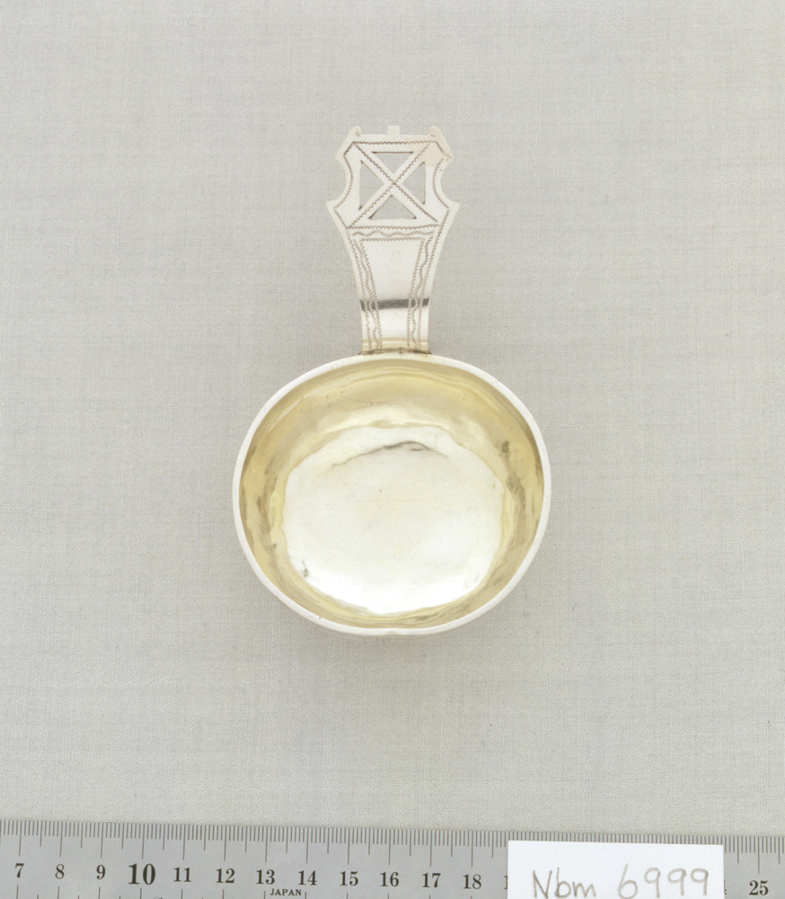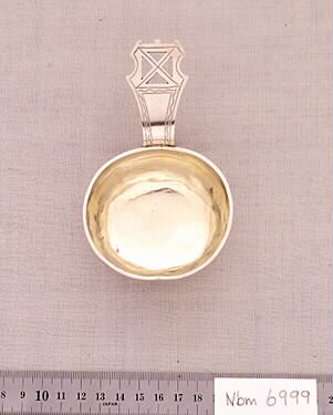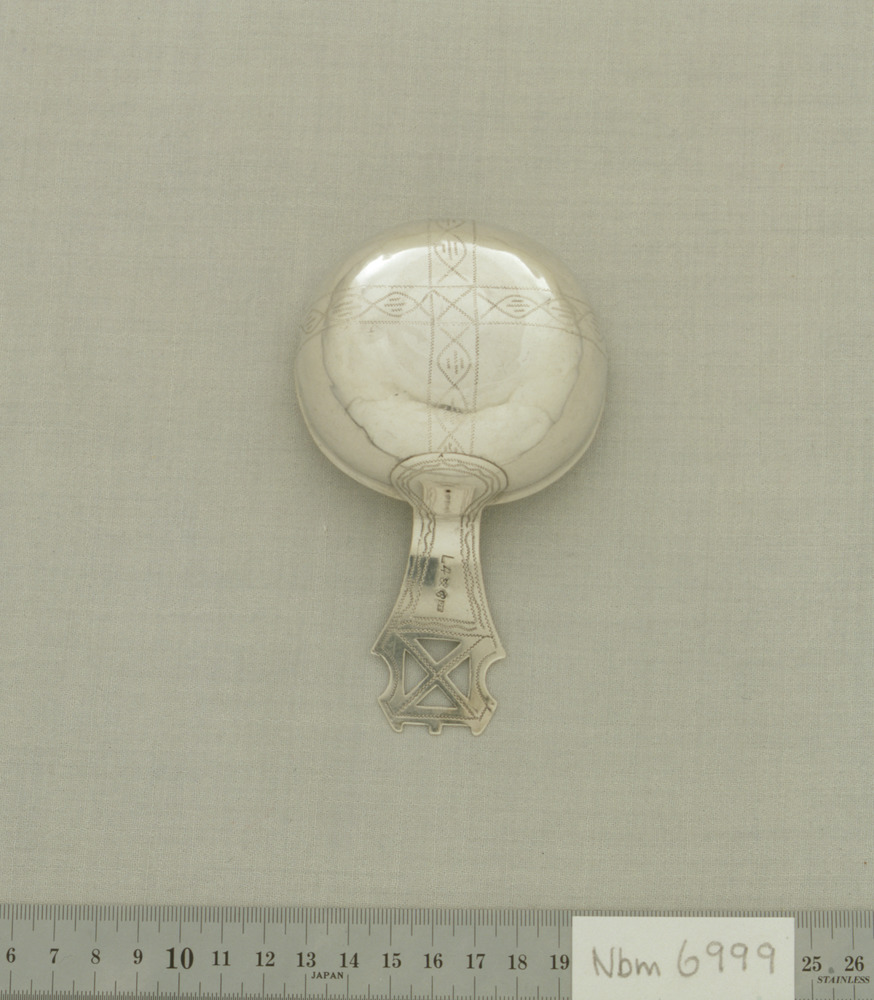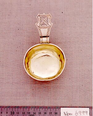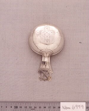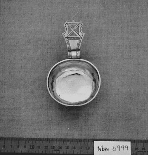 - Rund form med skaft. Invändigt förgylld. Snibb framtill. Baksidan dekorerad med ett kors av breda ränder med mjuka romber i. Varje romb har tre ränder i mitten. Runt kanten en linje. Skaftets övre del har en genombruten fyrkant med ett kryss i. Skaftets fram- och baksida har en bård med en våglinje i runt kanten, dessutom är krysset ifyllt med en linje. All dekor svisselerad. Stämplar: L4-Luleå stadsstämpel-tre kronor-0:F. *Bomärke: se skiss.