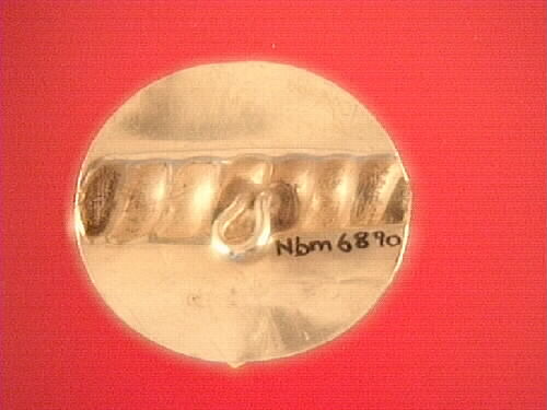 Rund platt form. Larvornament som dekor. Ornamentet sträcker sig över hela diagonalen. Ögla på baksidan för fastsyning. Stämplar: 0SE-tre kronor-S-Haparanda stadsstämpel-Z7.