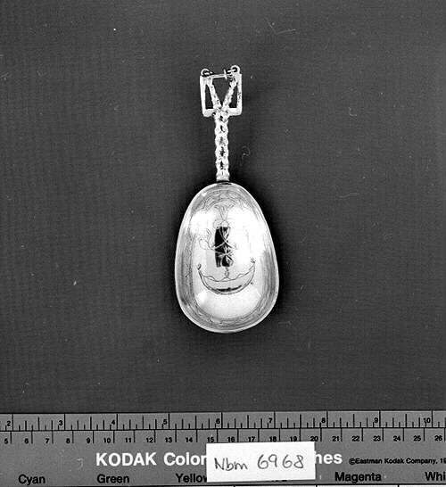 Päronformat blad, på insidan dekorerat med en bård en bit in från kanten, en halvmåne i nederdelen samt ovanför halvmånen ett floristiskt motiv. Förgylld. På baksidan en bård en bit in från kanten samt tre breda tvärränder med en våglinje i de två nedre. I den översta randen sitter stämplarna. Skaftet består av två snoddar som delar sig mot toppen. En fyrkant runt toppen med tre vidhängande ringar. Stämplar: EJB-Luleå stadsstämpel-tre kronor-H6.