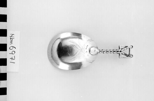 Päronformat blad, insidan förgylld, päronformad dekor samt bård runt kanten i svisselerad teknik. Baksidan har päronformad dekor samt halvcirkelformad bård ovanför, allt svisselerat. Snott skaft som delar sig i toppen och omges av en fyrkant. Två ringar har suttit i de översta hörnen på fyrkanten, men de saknas. Stämplar: C(?)5-Luleå stadsstämpel-tre kronor-IF.