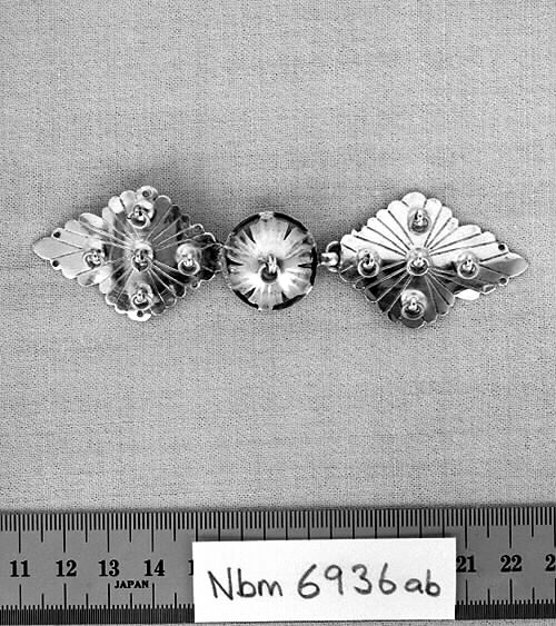 Spännet består av två delar vilka är romboid-samt lövformade. I mitten en halvkula, formad som sex välvda uddar (halvkulan sitter på hakedelen). Silverfärgad. Fem små ringar som dekor på vardera spännehalvan. Trambolerade (svisselerade) linjer som dekor. En ring på halvkulan. På baksidan av hyskedelen stämplar: OS- Haparanda stadsstämpel-R6.