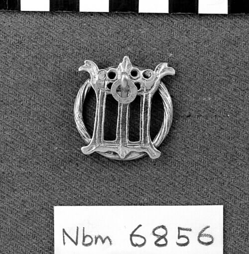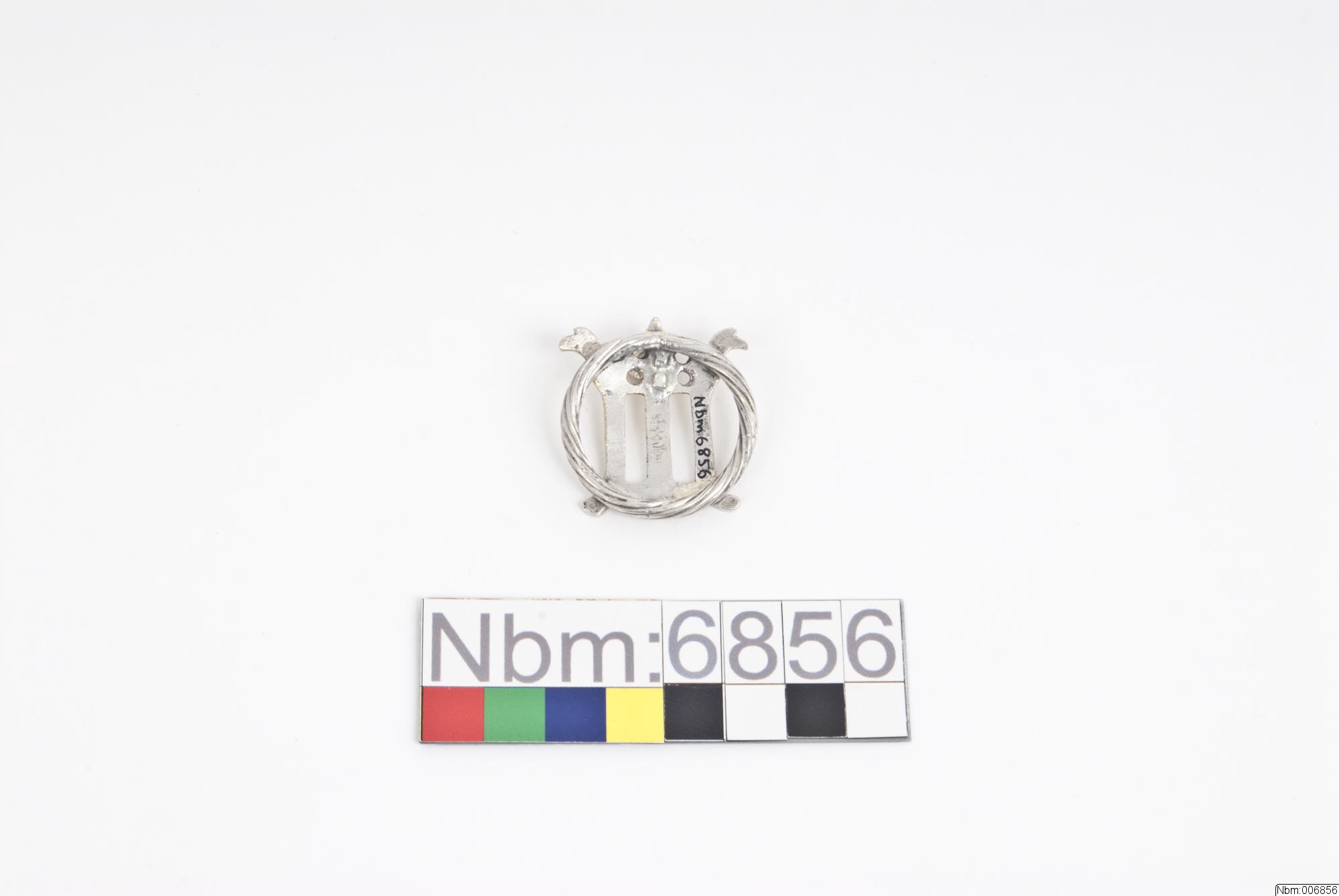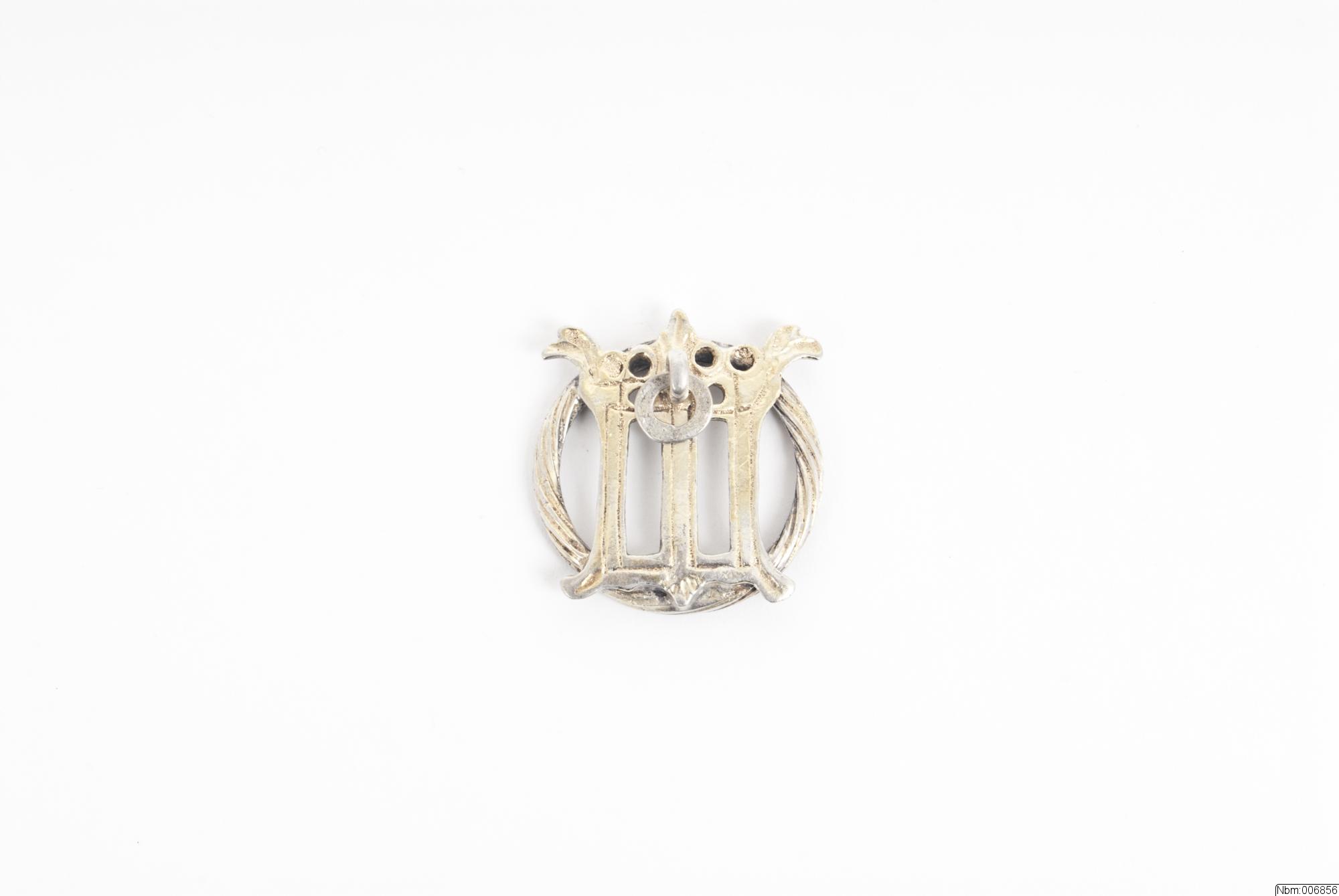 Rund, vriden ring med krönt Mariamonogram anbringad ovanpå. Överst i mitten en vidhängande ring. Delvis förgylld.